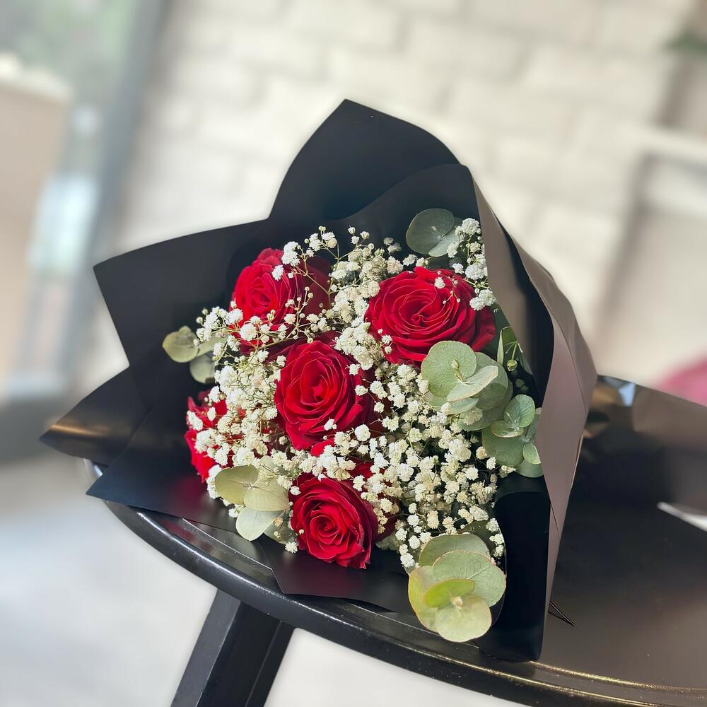Bu zarif mono buket, 5 adet canlı kırmızı gül, 10 adet narin cipso ve 9 adet taze okaliptüs dalıyla zanaatkârlıkla hazırlanmıştır. Sevdiklerinize verebileceğiniz bu büyüleyici ve zarif hediye, herkesin beğenisini kazanacak. Her dalıyla sevgi ve güzellik fışkıran bu güzel buket, masanızı, ofisinizi veya evinizi süslemek için mükemmel bir seçim olacaktır.