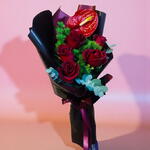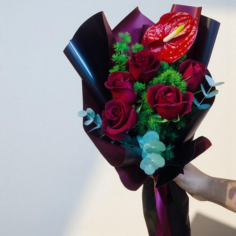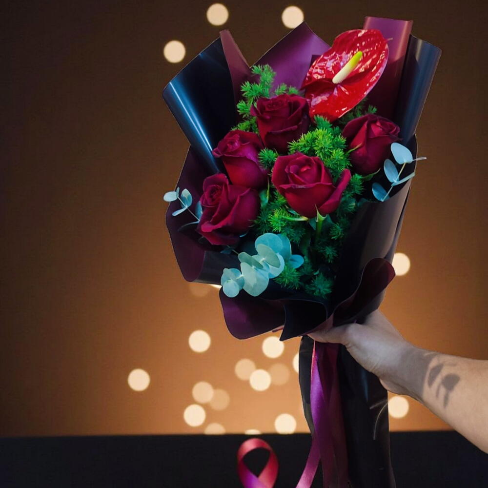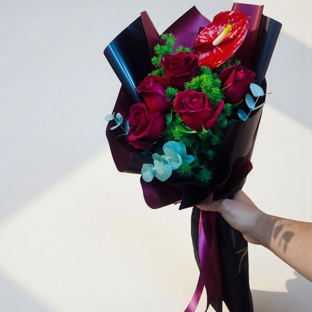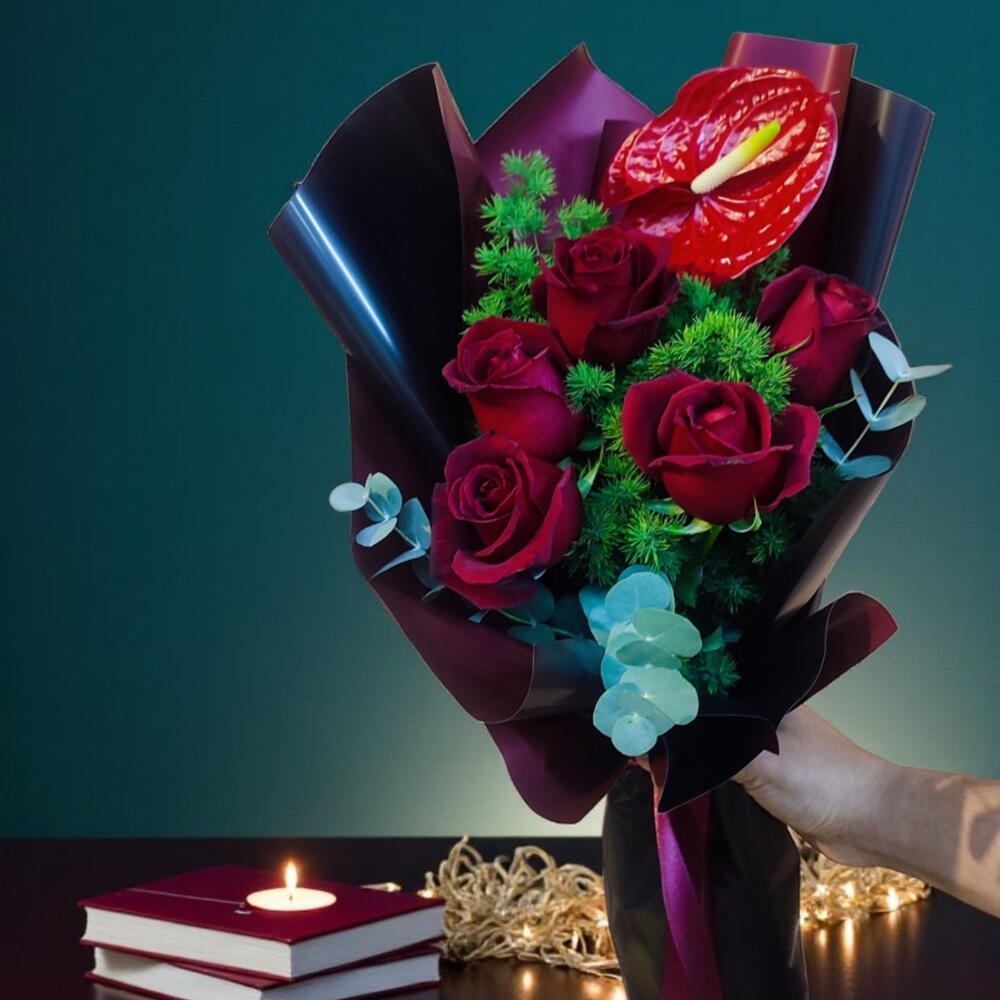 kırmızı gül - 5 adet okaliptüs dalı - 3 adet antorium local red - 1 adet çam yaprağı - 1 adet