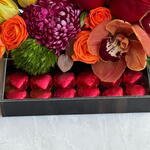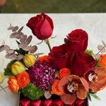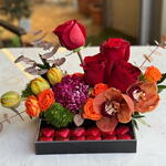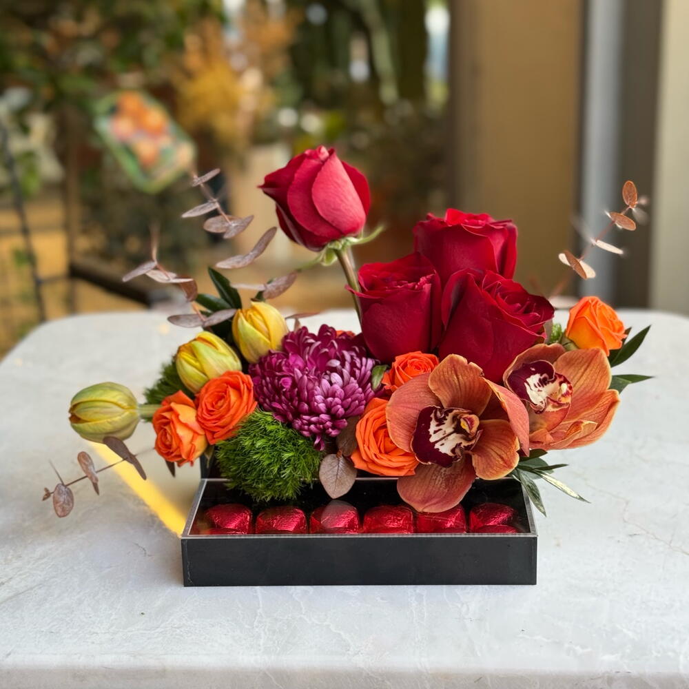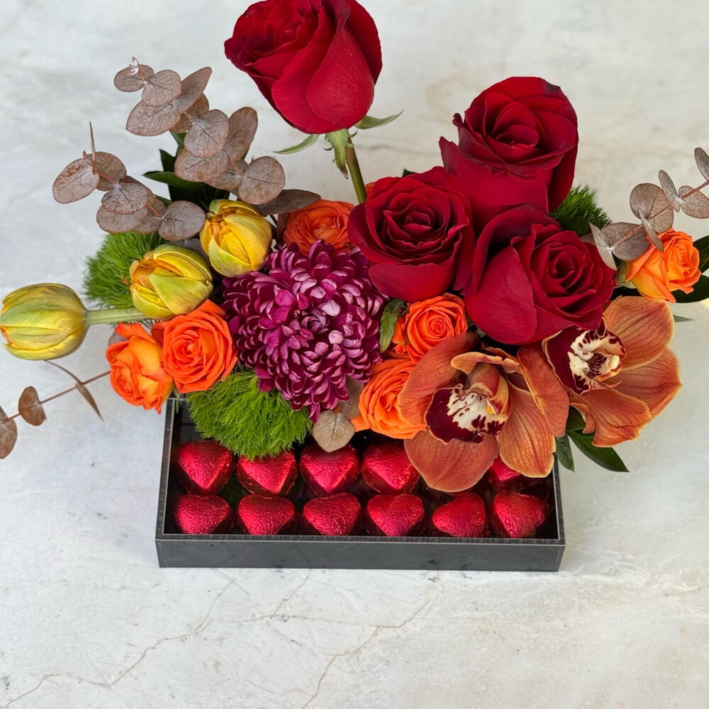 Canlı renklerin uyumuyla hazırlanan bu özel aranjman; turuncu laleler, kırmızı güller, orkide ve mevsim çiçekleriyle zenginleştirilmiştir. Alt kısmındaki kalp formunda çikolatalar, aranjmana tatlı ve romantik bir dokunuş katar. Şık ve modern tasarımıyla doğum günü, yıldönümü ve özel anlar için göz alıcı bir hediye seçeneğidir. Taze çiçeklerle özenle hazırlanır, aynı gün teslimatla gönderilir.