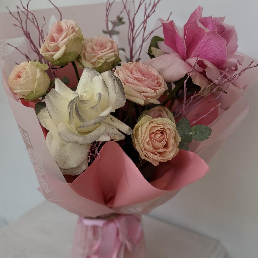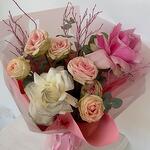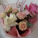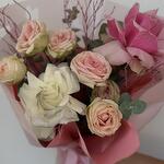 Хороший букетик, необычный, самый недорогой с розами. Внизу, вроде как, флористическая губка. Доставка отлично в срок.