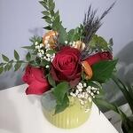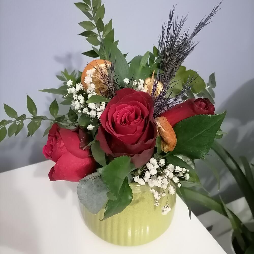 Bu zarif dekoratif çiçek seti, evinizin veya ofisinizin her yerinde doğal bir dokunuş yakalamanız için idealdir. Set, kırmızı güller, beyaz cipso, kuru portakal dilimleri ve okaliptüs yapraklarından oluşan bir çiçek aranjmanı ve yeşil vazo içerir. Bu muhteşem combinasyon, herhangi bir alana zenginlik ve sıcaklık katacaktır. Her detayı özenle düşünülmüş bu set, zevkinizi yansıtmak için mükemmel bir şekilde tasarlanmıştır.