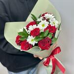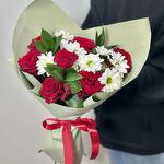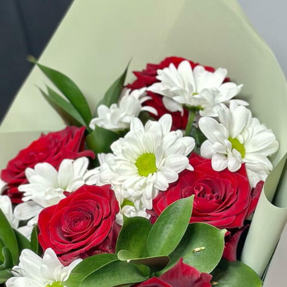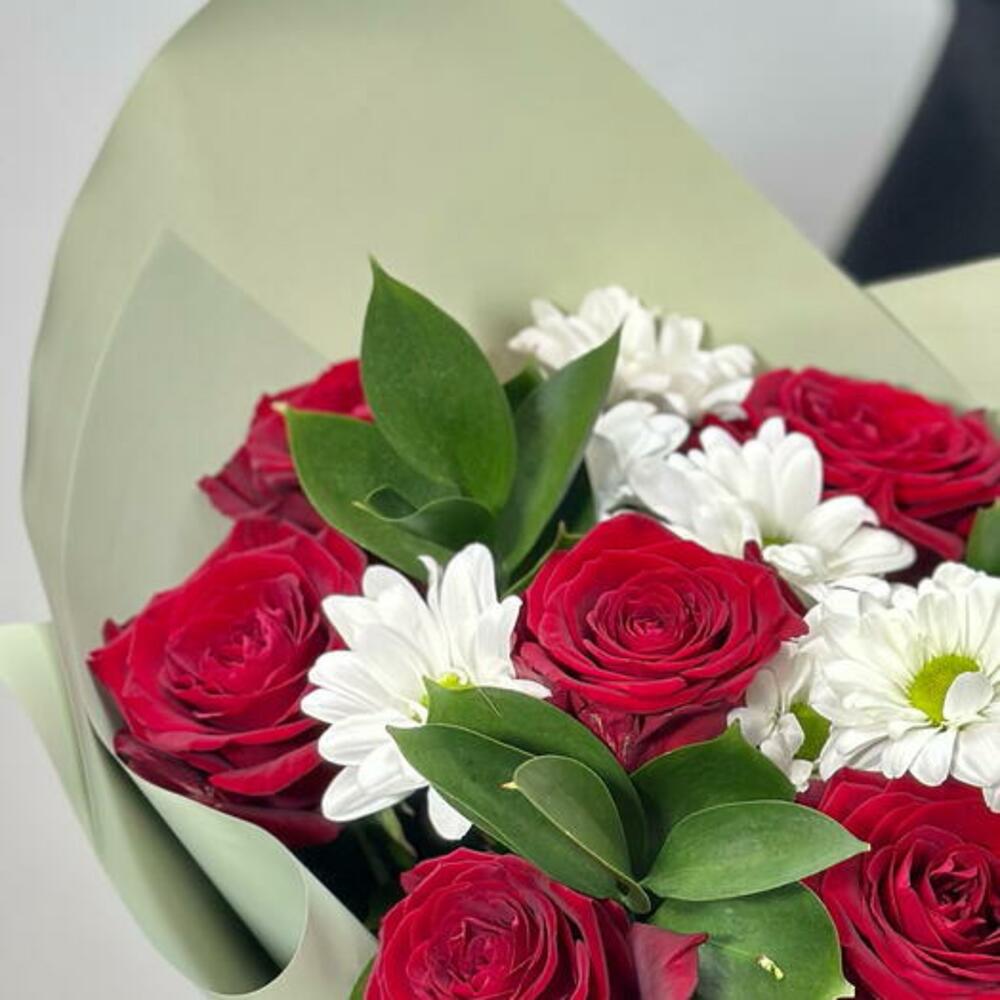 Ruscus - 3 adet kırmızı gül - 7 adet ambalaj - 1 adet beyaz çalı krizantem - 2 adet