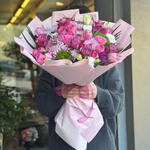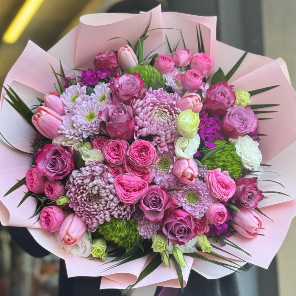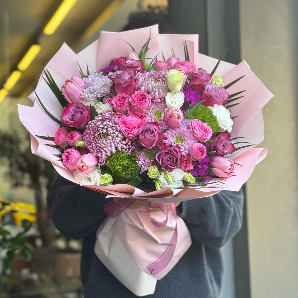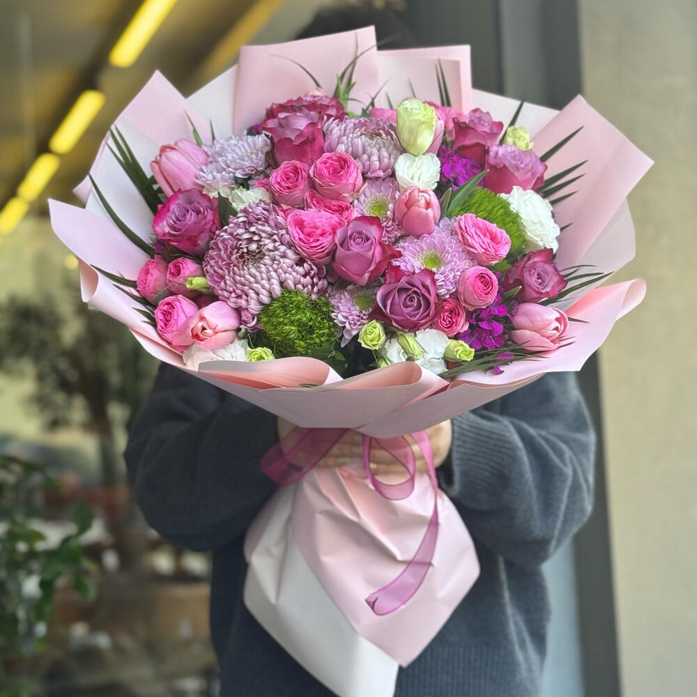 Pembe tonların uyumuyla hazırlanan bu şık ve dolgun buket, zarif görünümüyle her özel ana eşlik eder. Pembe güller, mini güller, krizantemler, laleler ve mevsim çiçekleri; modern pembe ambalaj ve kurdele ile özenle sunulmaktadır. Doğum günü, yıldönümü, teşekkür, geçmiş olsun veya romantik sürprizler için ideal bir tercihtir. El buketi formundadır ve fotoğraftaki stile uygun şekilde hazırlanır.