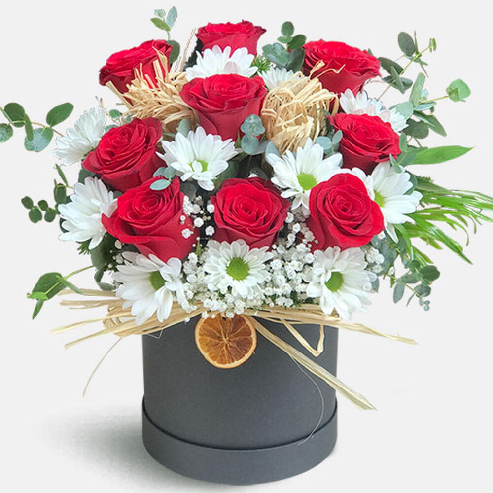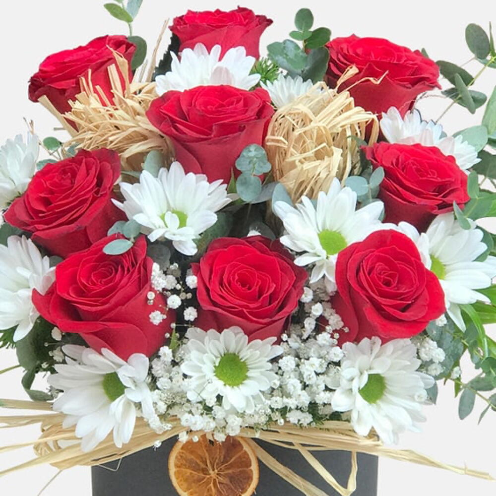 kırmızı gül - 9 adet papatya - 10 adet okaliptus - 8 adet portakal - 1 adet hasır ip - 3 adet