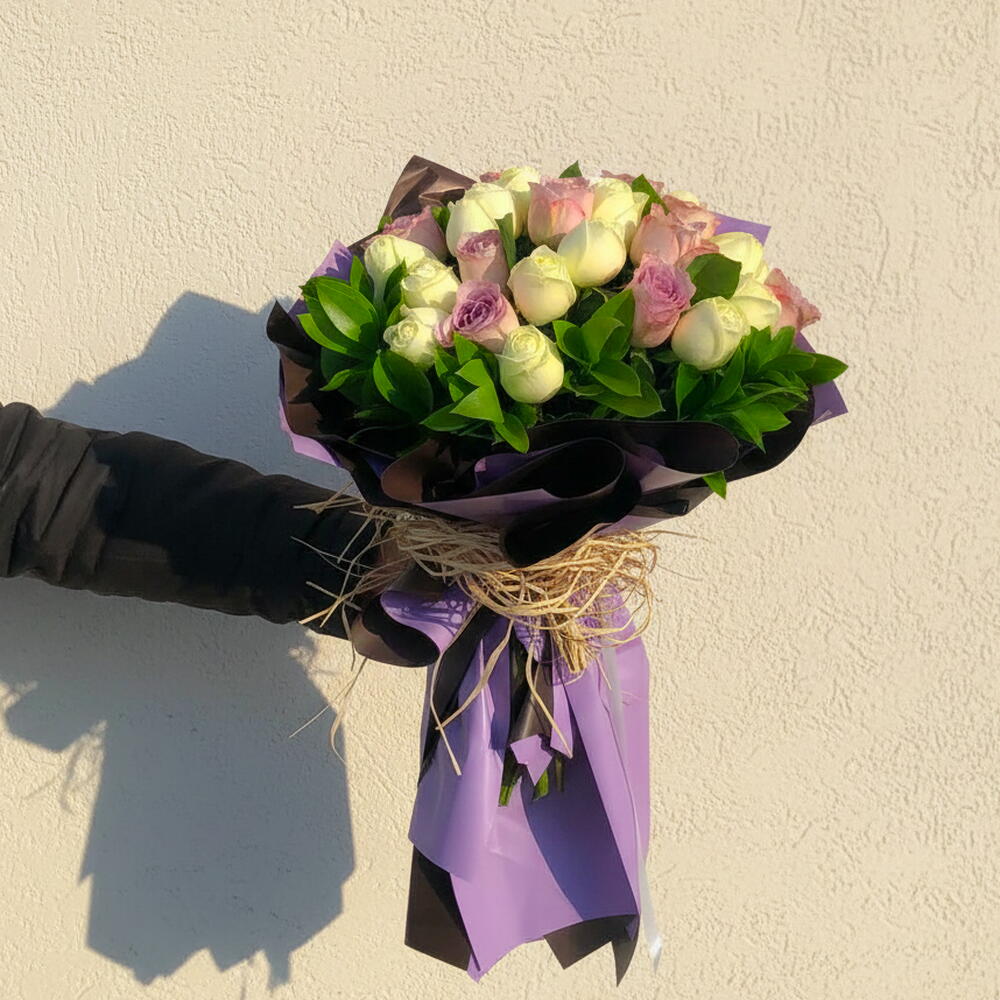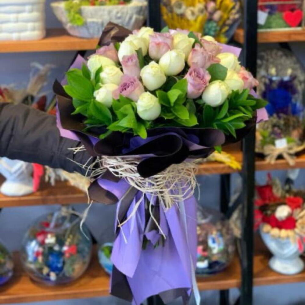 yeşillik - 10 adet lila güller - 14 adet beyaz güller - 15 adet