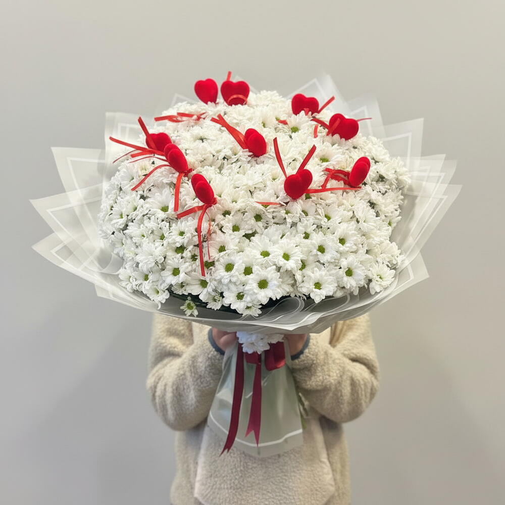Bu muhteşem çiçek buketi, size 100 adet büyük boy papatya ve romantik bir dokunuş için 10 adet kalp dekoratif çubuk içerir. Sıradışı ve unutulmaz bir sürpriz için mükemmel bir seçim olan bu buket, herkese doğanın zarafetini ve aşkın güzelliğini hatırlatır. Her bir papatya dikkatlice seçilmiş ve özenle düzenlenmiş, kalp çubukları ise tatlı ve romantik bir atmosferi garantiler. Bu özel çiçeklere sahip olan bu sevimli buket, hem görünüşü hem de anlamıyla sevdiklerinize ne kadar değerli olduklarını gösterecektir. Ne olursa olsun, bu çiçek buketi, özel biri için mükemmel bir hediyedir.
