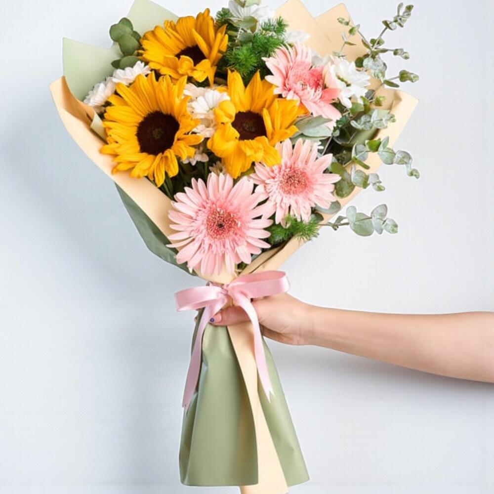 Bu zarif çiçek buketi, 3 adet güneşi anımsatan ayçiçeği, 5 adet masum beyaz papatya ve 3 adet canlı pembe gerbera ile hazırlanmıştır. Bu buket, sevdiklerinize neşe ve enerji dolu bir gün dilerken, aynı zamanda onlara ne kadar değerli olduklarını da hissettirecek. İster doğum günü olsun, ister yıldönümü, bu çiçek buketi her zaman kalpleri ısıtacak ve güzel anılar yaratacaktır.
