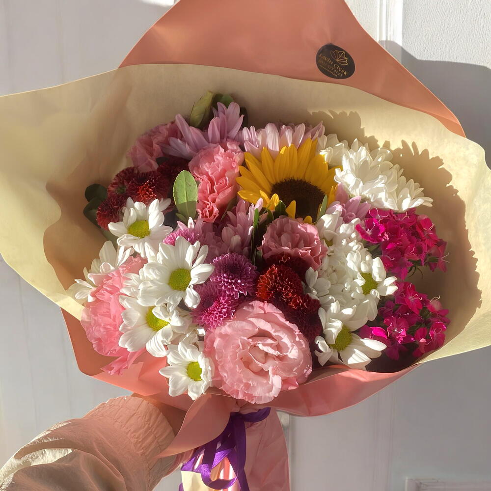 ayçiçeği - 1 adet beyaz papatya - 5 adet pembe karanfil - 3 adet mor minyatür krizantem - 4 adet dolgu yeşillikleri - 2 adet pembe şakayık gül - 2 adet kırmızı krizantem - 3 adet