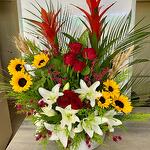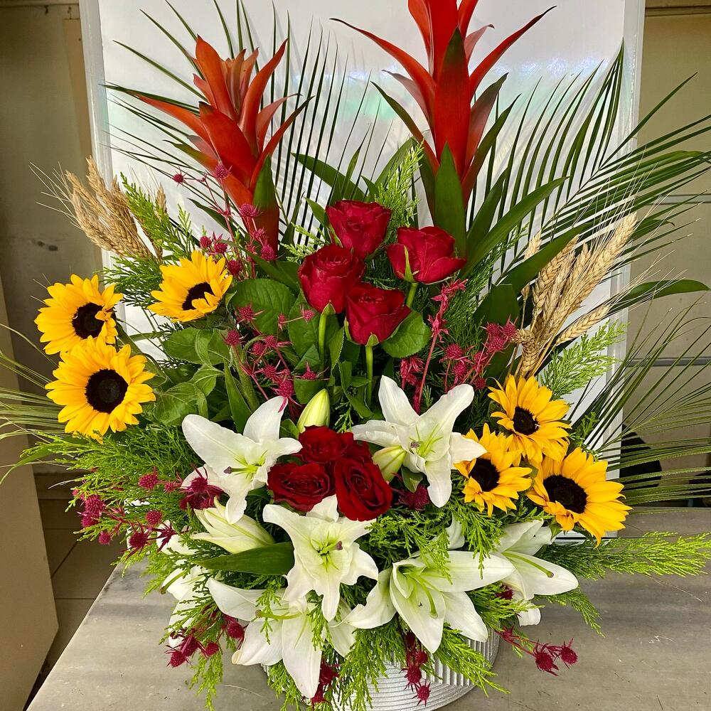 Dekoratif seramik saksıda iki adet guzmanya Yedi adet kırmızı gül ve altı adet günebakan 7adet beyaz lilyum