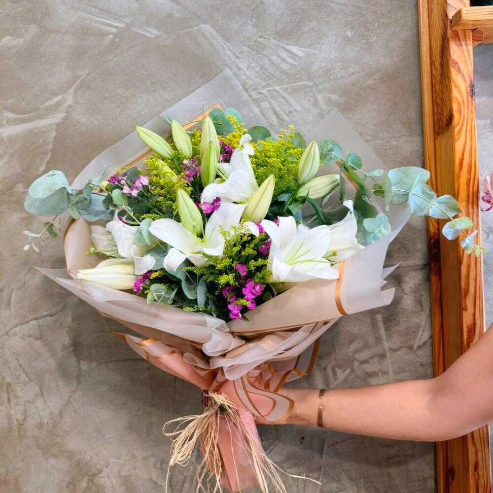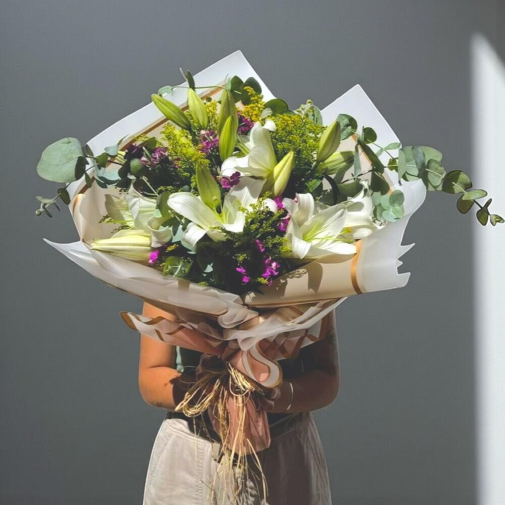 Beyaz zambakların zarafeti, mor çiçeklerin göz alıcı güzelliği ve okaliptüs yapraklarının taptaze yeşilliğiyle süslenmiş bu özel buket, her ortamı aydınlatacak eşsiz bir seçenektir. Doğal tonların uyumu, minimalist ama etkileyici bir şıklık sunar. Sevdiklerinize duyduğunuz sevgiyi en güzel şekilde ifade etmek için mükemmel bir tercihtir. Çiçeklerin uzun ömürlü olması için serin bir ortamda muhafaza edilmesi, doğrudan güneş ışığından korunması ve 2 günde bir suyun değiştirilmesi önerilir. Ayrıca, sapları belirli aralıklarla kısaltarak suyun daha iyi emilmesini sağlayabilirsiniz. Bu zarif buket ile sevdiklerinize unutulmaz bir hediye sunabilirsiniz.