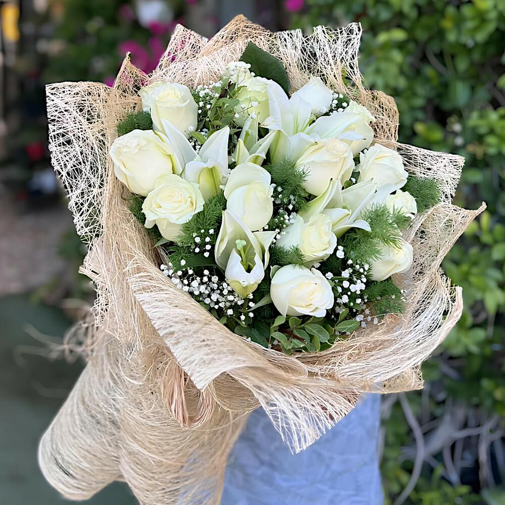Beyaz güllerin ve zarif calla zambaklarının birleşimi, saflığı ve sonsuz sevgiyi simgeler. Özel günler, düğünler ve içten duygularınızı ifade etmek için ideal bir seçim.