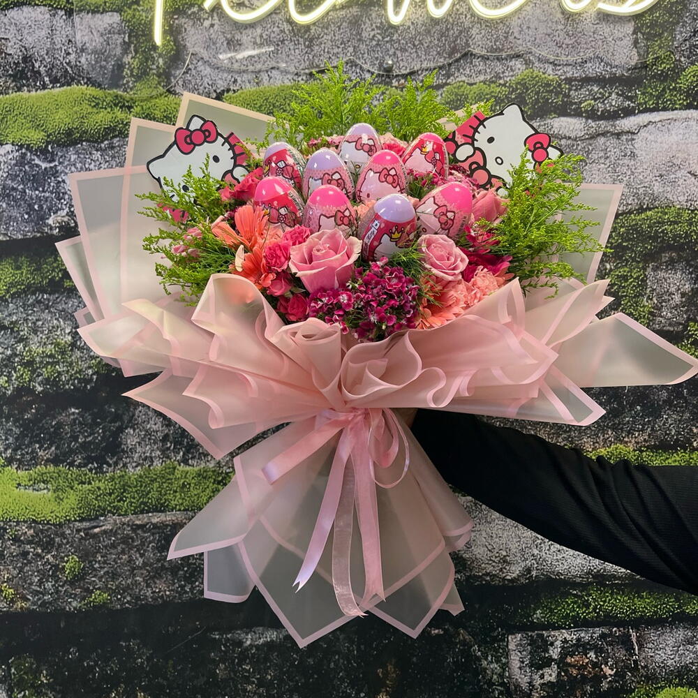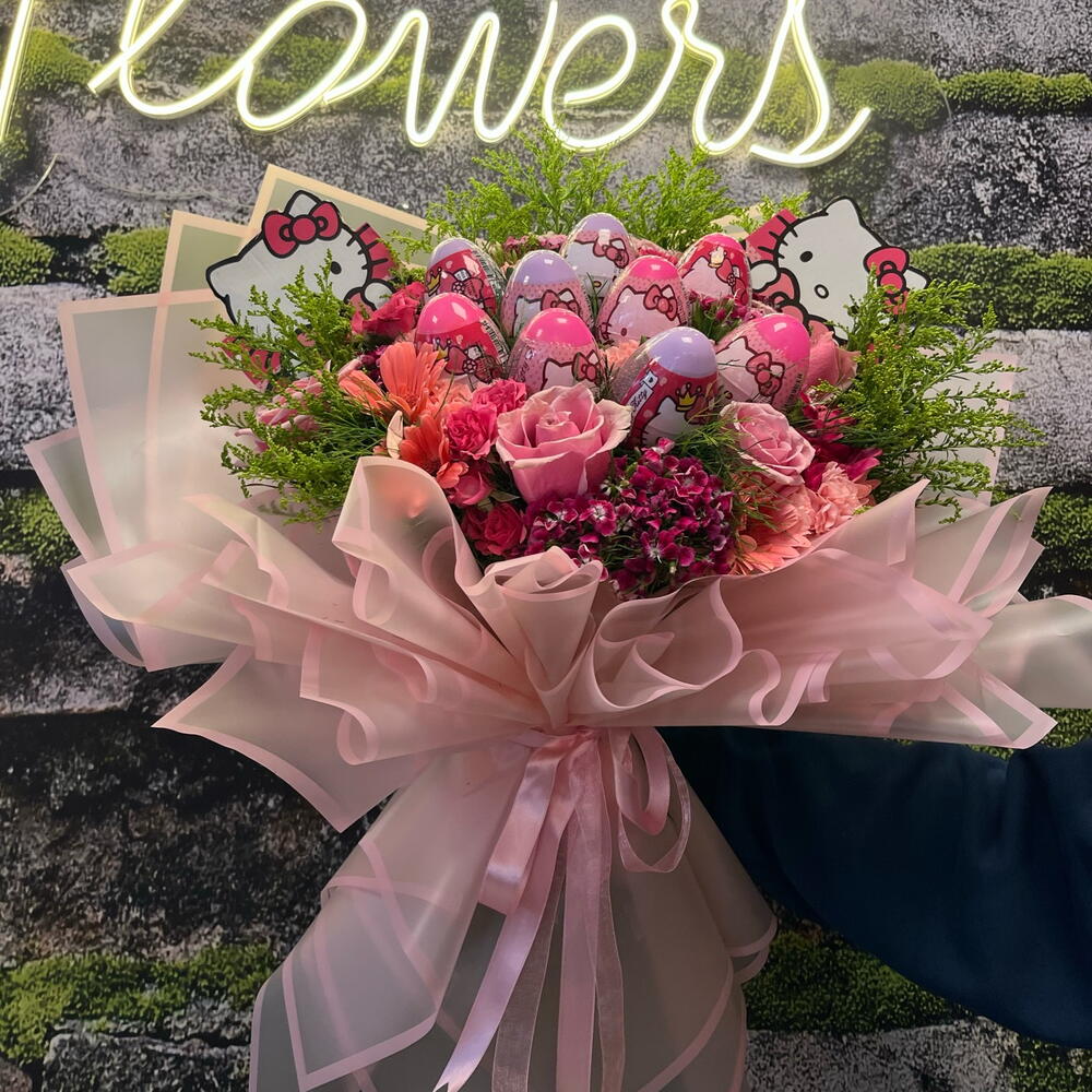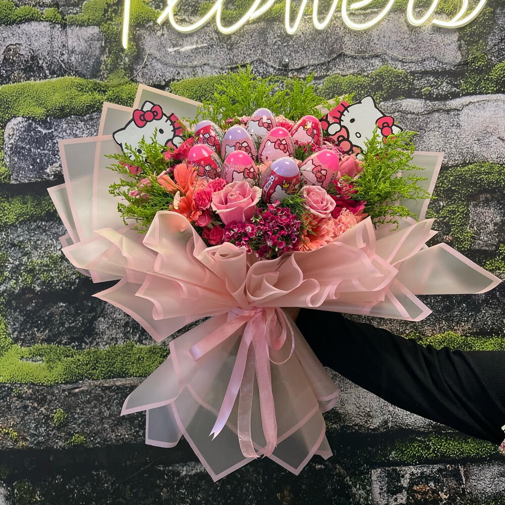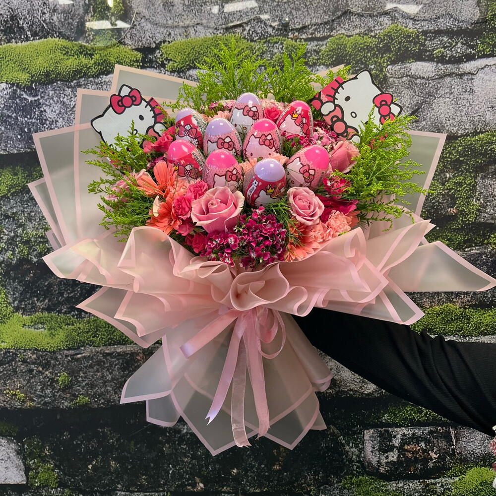 Hello kitty - 2 adet gerbera mini - 4 adet solidaster - 7 adet pembe gül - 3 adet virgatus - 20 adet çardak gül - 5 adet hüsnüyusuf çiçeği - 5 adet pembe karanfil - 8 adet yumurta - 9 adet