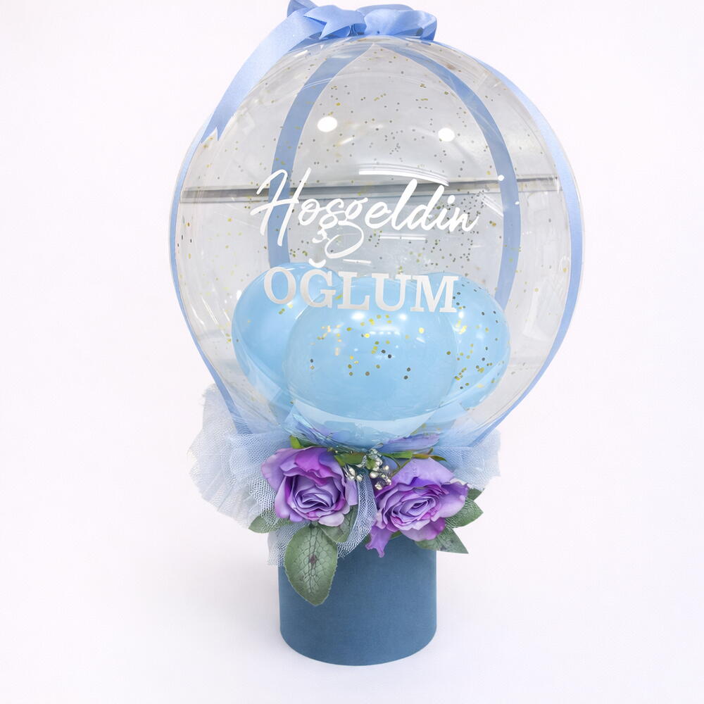 Şeffaf bubble balon, içerisinde 2 adet açık mavi balonla süslenmiş bir adet karışık buket. Bu çarpıcı bileşenleri 2 adet mor dekoratif gül ve 1 adet beyaz mini dolgu çiçek takip eder. Tüm bu ögeler, zarif bir mavi silindir kutuda sunulmaktadır. Bu ürün, bir sevdiklerinize hediye olarak mükemmel bir seçenek olacak ve herhangi bir özel olayı unutulmaz bir anıya dönüştürecektir.