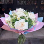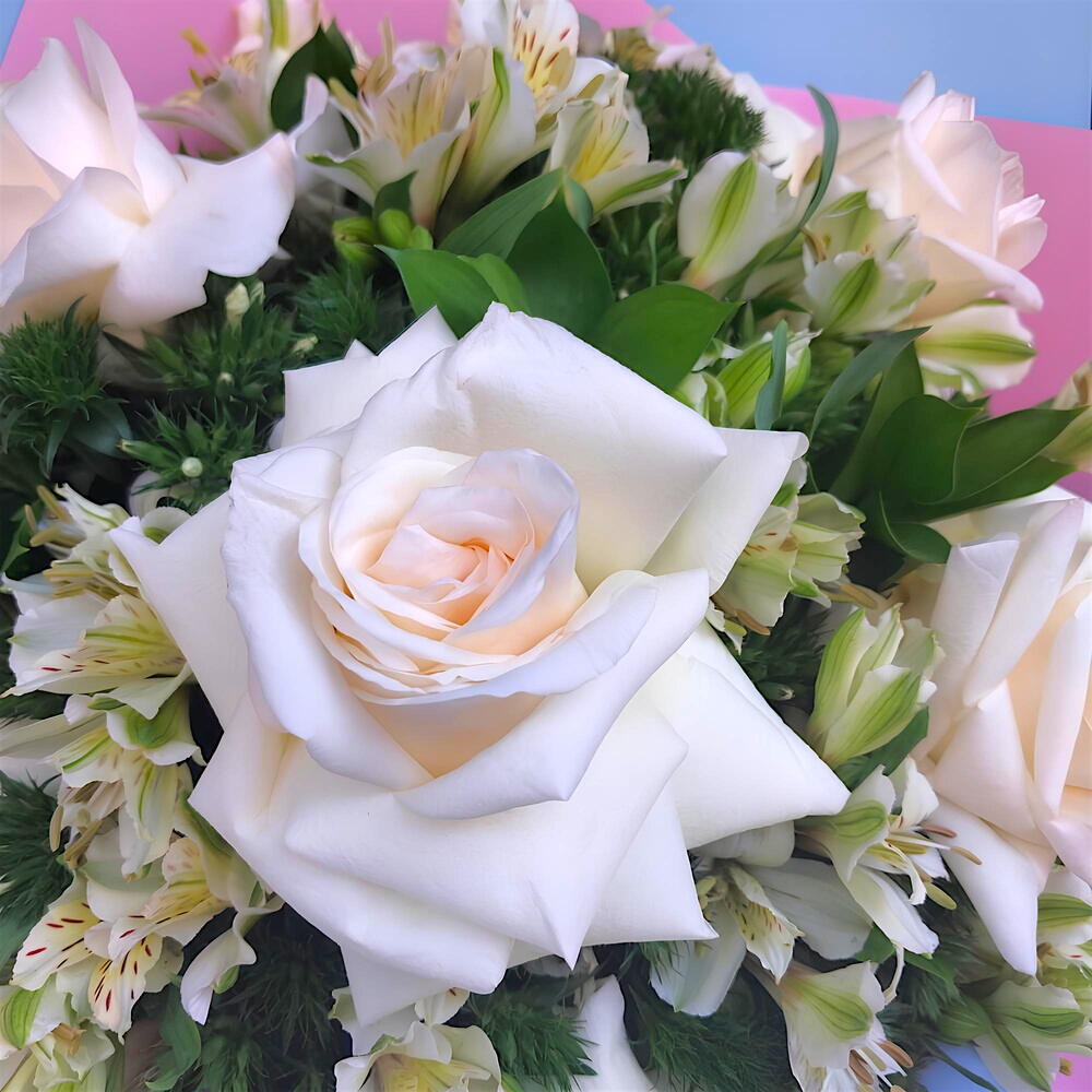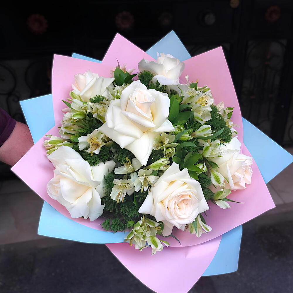 İthal beyaz güller ve Astomerialardan oluşan aralarında Greentrechk ile zenginleştirilmiş soft renkli ambalaj malzemesi ile sarılmış şık bir buket