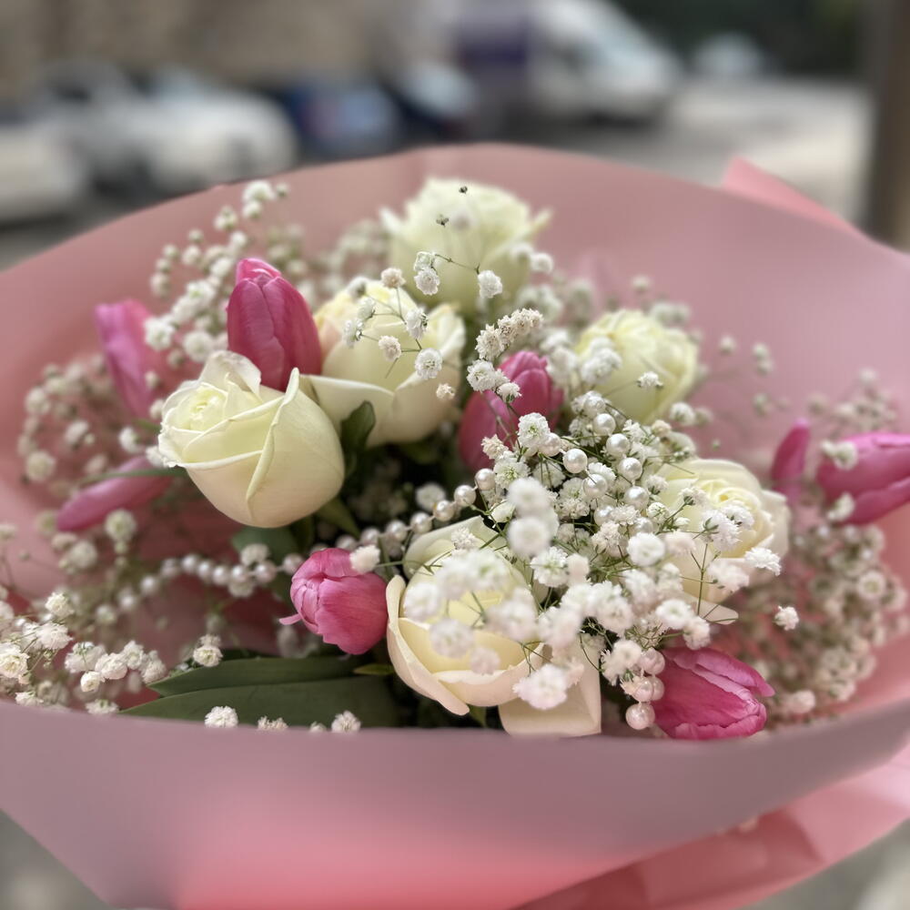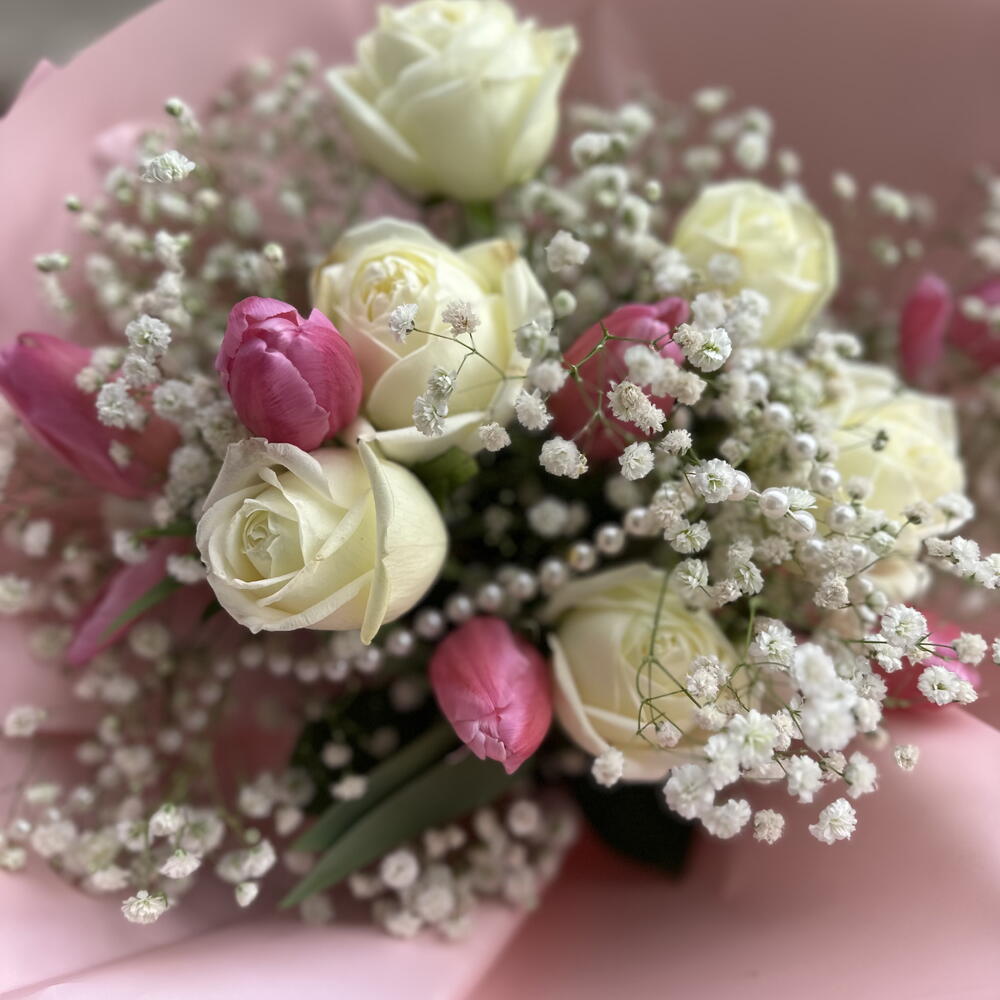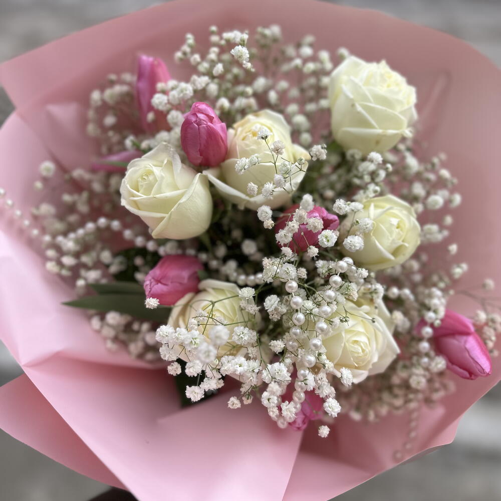 beyaz gül ithal - 6 adet cipsofilya - 5 adet lale pembe - 6 adet