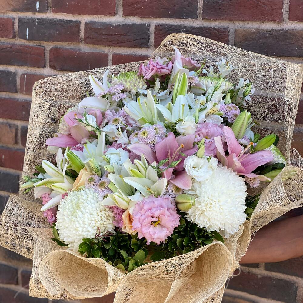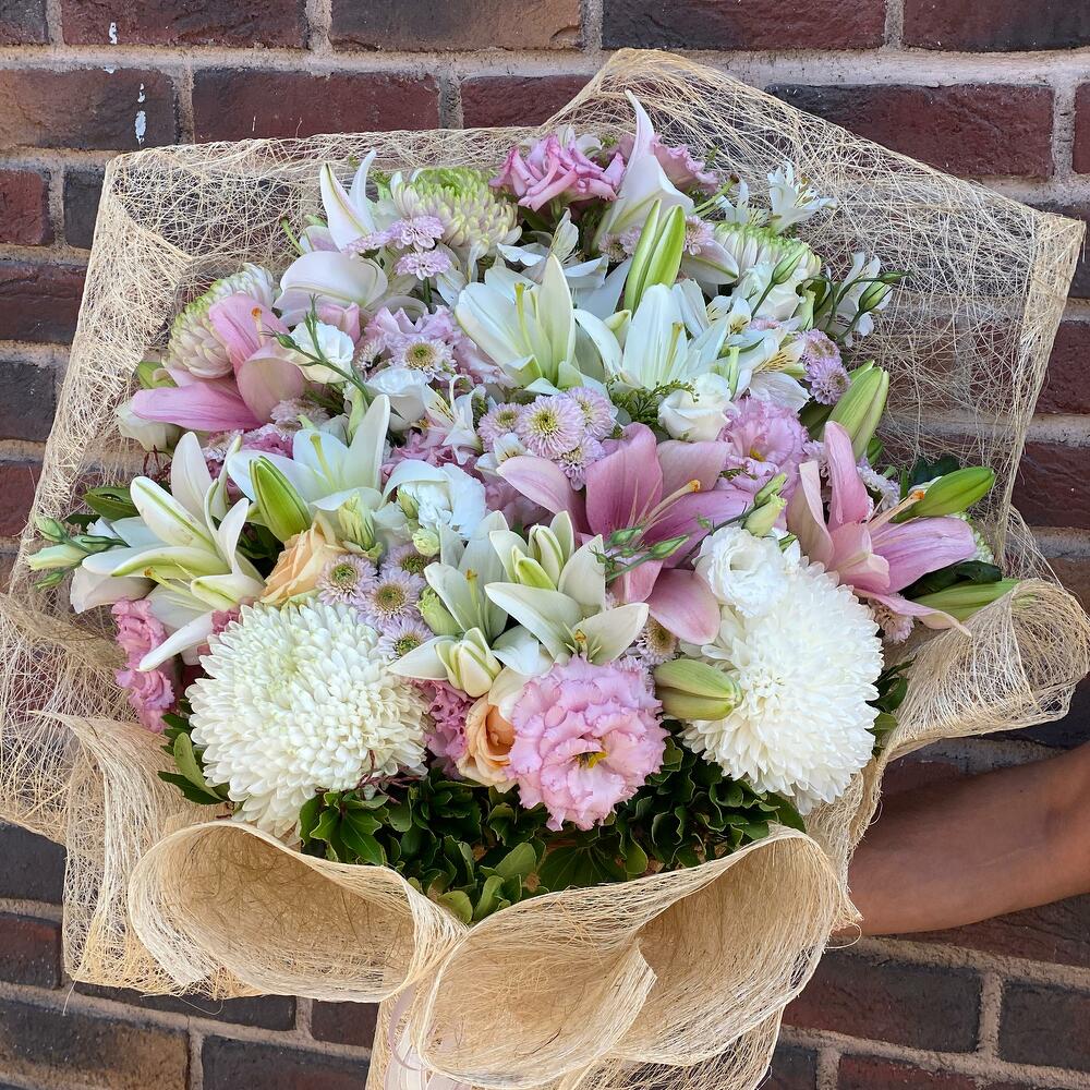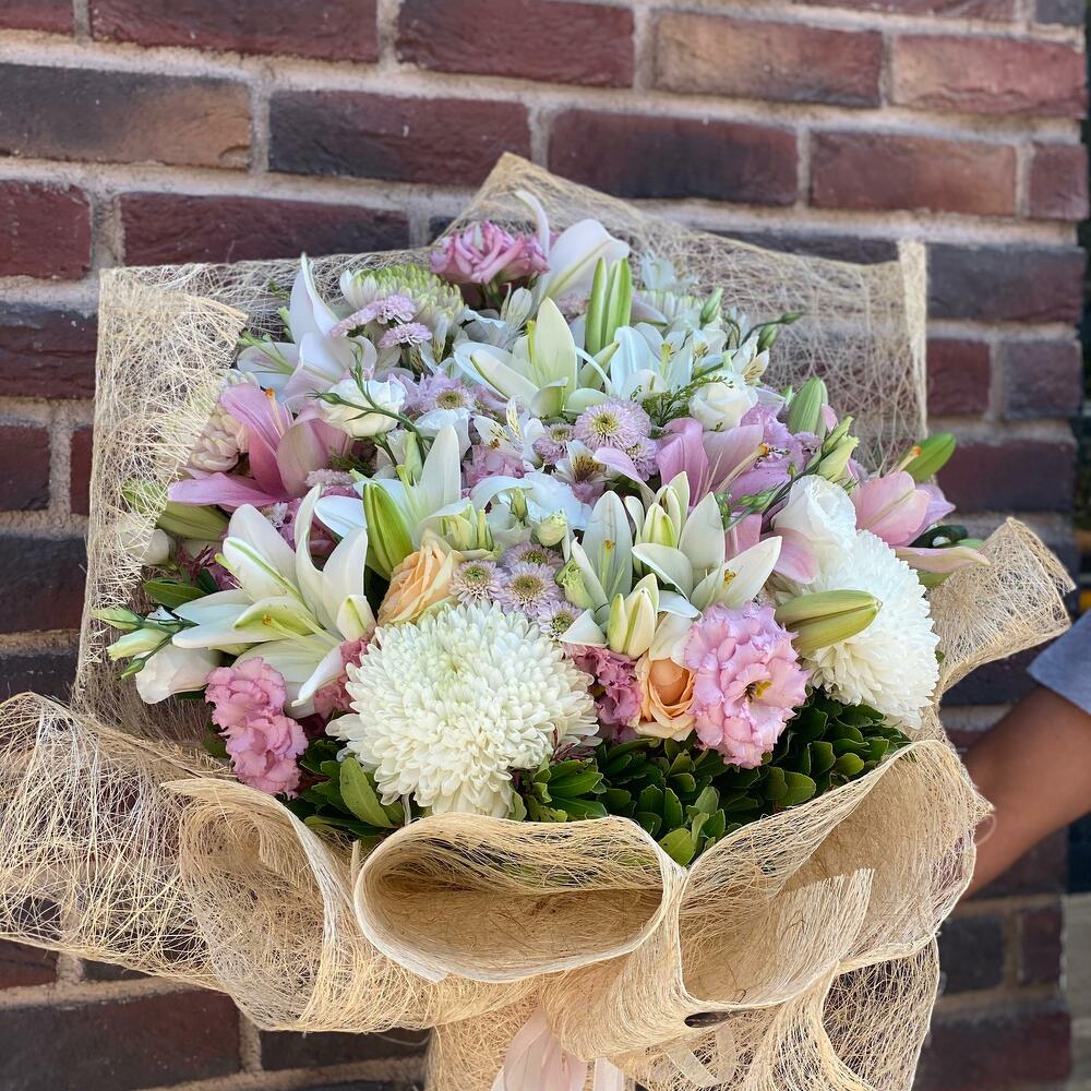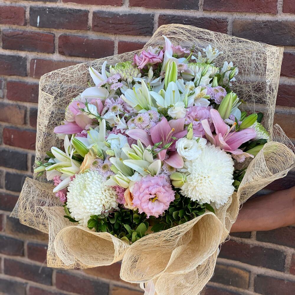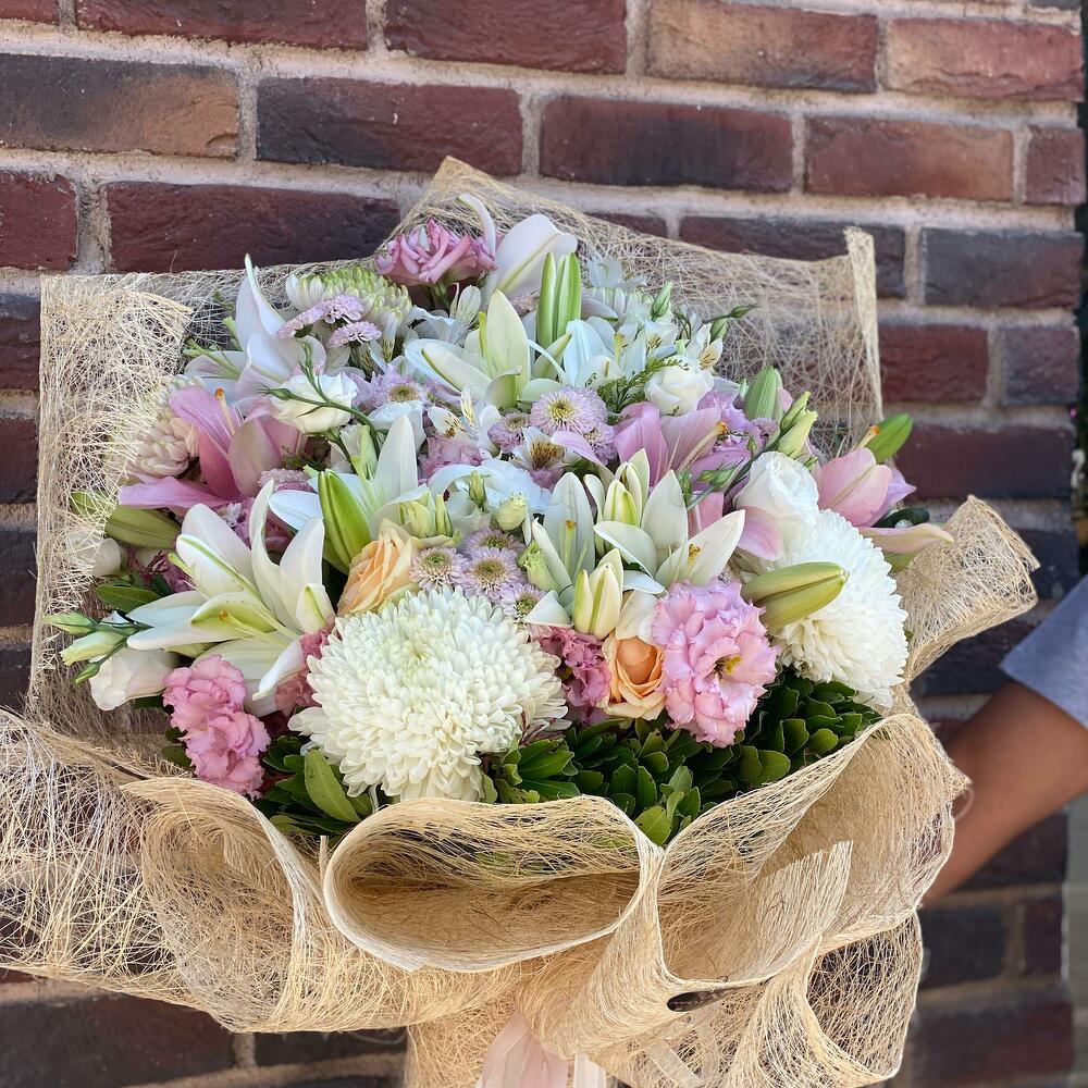 Bu çarpıcı Karışık Buket, dikkatlice seçilen ve zarifçe düzenlenmiş çiçeklerle doludur. Asil beyaz lisianthuslar (10 adet), duygusal anları simgeleyen pembe lisianthuslar (15 adet) ve zarif krizantemlerle (10 adet) oluşturulmuştur. Tüm bu çiçekler, daha da fazla çarpıcılık katmak için anastasia blanca (5 adet), astomeria (10 adet), anastasia beyaz (2 adet), lilyum asya beyaz (4 adet) ve lilyum asya pembe (4 adet) ile birleşiyor. Bu kadar özenle düzenlenmiş bir buketi tamamlamak için abaka ambalaj (6 adet) ve saten kurdele (2 adet) kullanıyoruz. Bu büyüleyici buket, her türlü özel günü daha özel kılar.