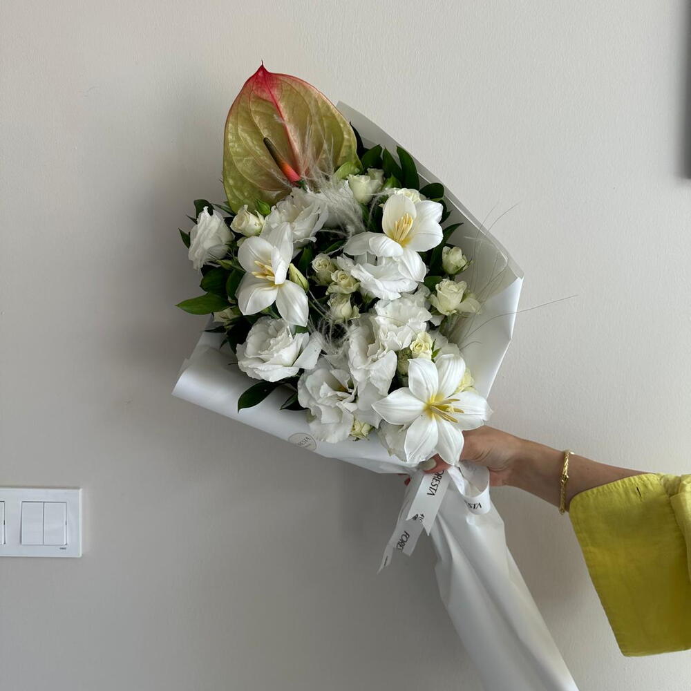 buket kağıdı - 2 adet lale - 4 adet antoryum - 1 adet lisiyantus - 2 adet