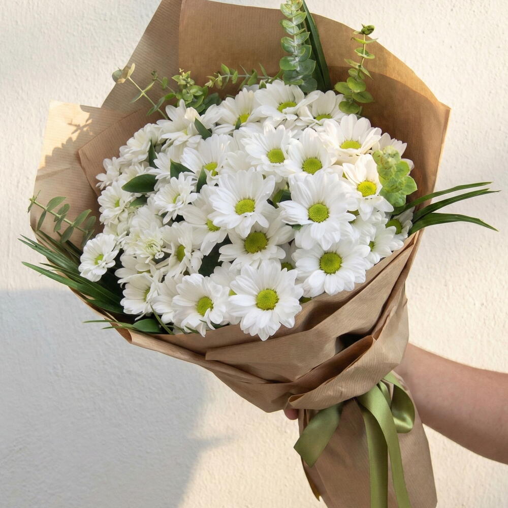 Bu zarif çiçek buketi, doğanın tazelik ve zarafetini simgeliyor. Buket, 7 adet beyaz papatya ve 4 dal okaliptüs ile detaylandırılmıştır. Sade ve sofistike bir aranjman olan bu buket, her türlü özel anınızı kutlamak için mükemmel bir seçimdir.