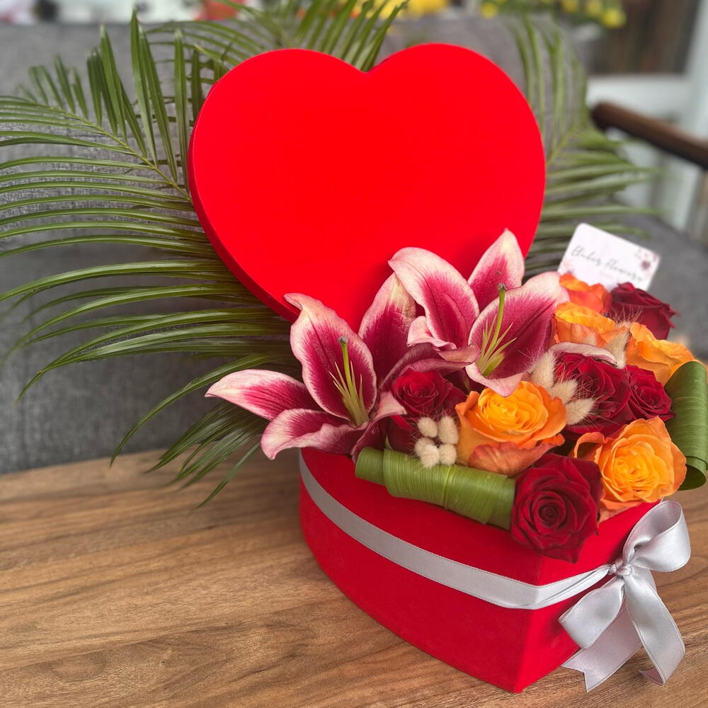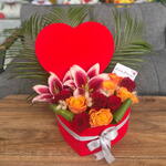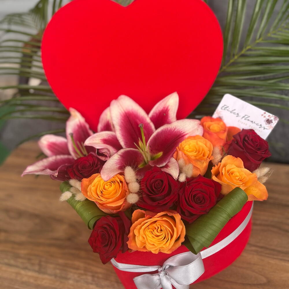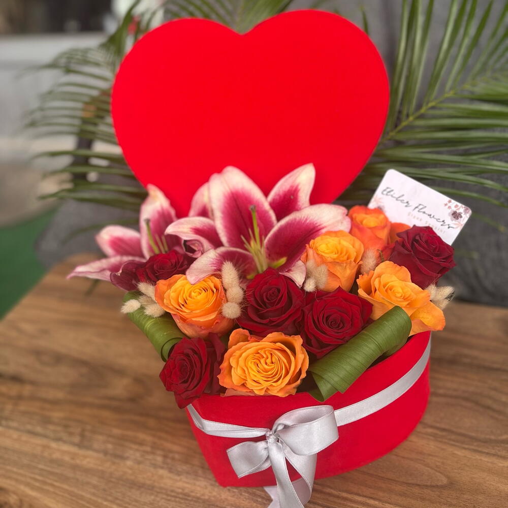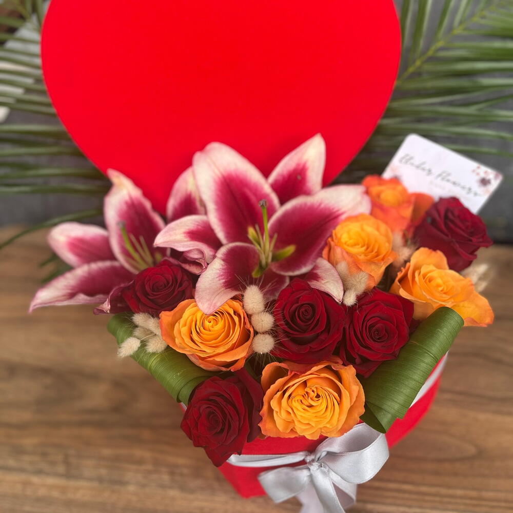 kırmızı gül - 5 adet turuncu gül - 5 adet lilyum pembe - 3 adet