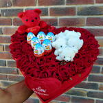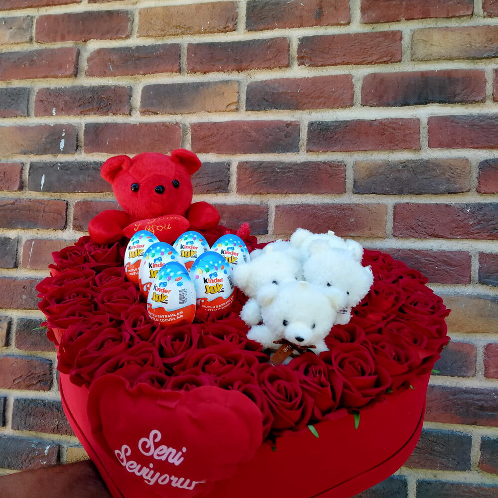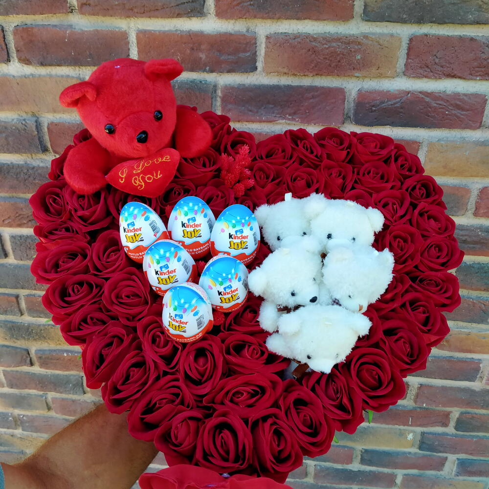 kırmızı gül - 45 adet ayıcık - 1 adet sürpriz yumurta - 6 adet ayıcık mini oyuncak - 8 adet i̇ love you kalp - 1 adet