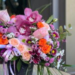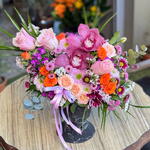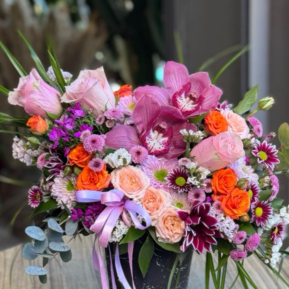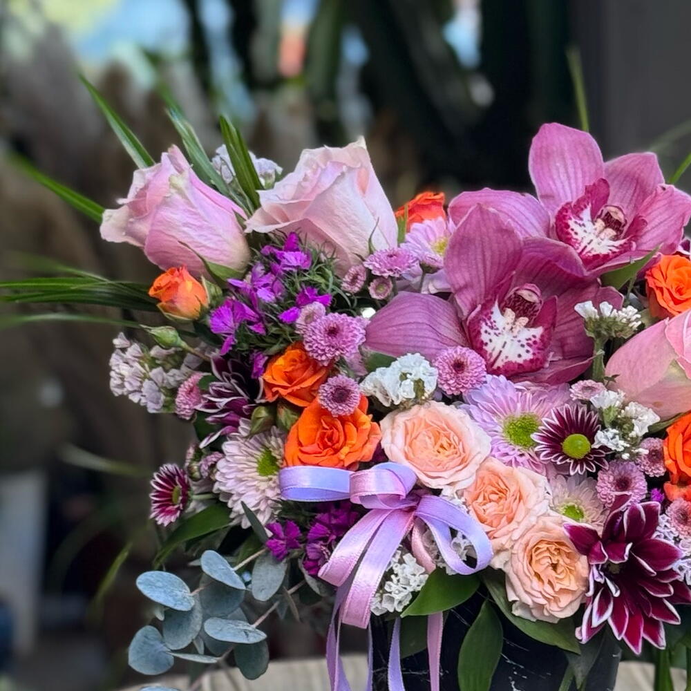 Zarafet ve enerjinin buluştuğu Kandilli orkide ve güller Vazoda Aranjman, pembe orkide, turuncu ve somon güller, mor krizantemler ve mevsim çiçeklerinin büyüleyici uyumuyla hazırlandı. Şık siyah mermer desenli vazosuyla her mekâna modern bir dokunuş katarken, renklerin dansı duygularınızı en zarif şekilde yansıtır. Doğum günü, yıldönümü, kutlama veya “seni düşünüyorum” demek için ideal bir hediye seçeneğidir.