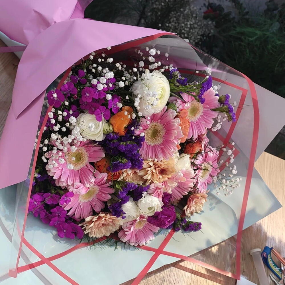 Gerbera - 10 adet statis - 4 adet cipsofilya - 5 adet şakayık sprey gül - 3 adet hüsnü yusuf çiçeği mor - 4 adet