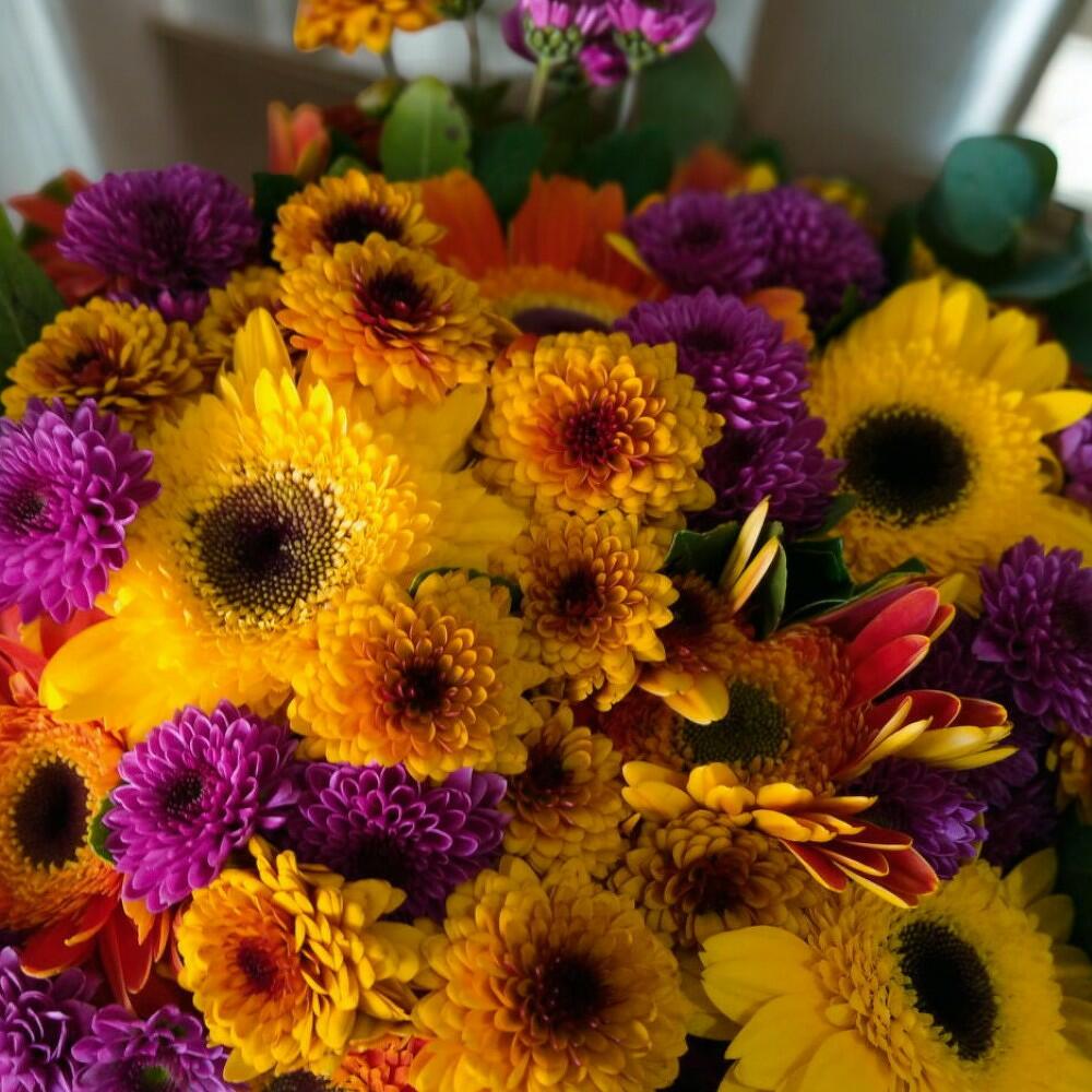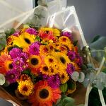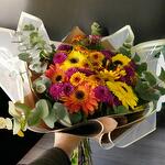 Renklerin enerjisini bir araya getiren bu özel buket, canlı sarı, turuncu ve mor tonlarıyla tam bir bahar esintisi sunuyor. Gerbera, krizantem ve okaliptüs dallarının mükemmel uyumu sayesinde hem sıcak hem de sofistike bir görünüm kazandırılmıştır. Sevdiklerinize neşe ve mutluluk katmak için harika bir seçimdir! Bakım Önerileri: Çiçeklerin uzun süre taze kalması için temiz bir vazo içerisine soğuk su koyarak yerleştirin ve her gün suyunu değiştirin. Doğrudan güneş ışığından ve rüzgârdan koruyarak çiçeklerin canlı kalmasını sağlayabilirsiniz. Buketi serin bir ortamda tutarak çiçeklerin ömrünü uzatabilirsiniz. Sapları birkaç günde bir 1-2 cm keserek suyu daha iyi emmelerini destekleyebilirsiniz. Bu göz alıcı ve enerjik buket, sevdiklerinize neşeli ve pozitif bir sürpriz yapmak için mükemmel bir seçenek!