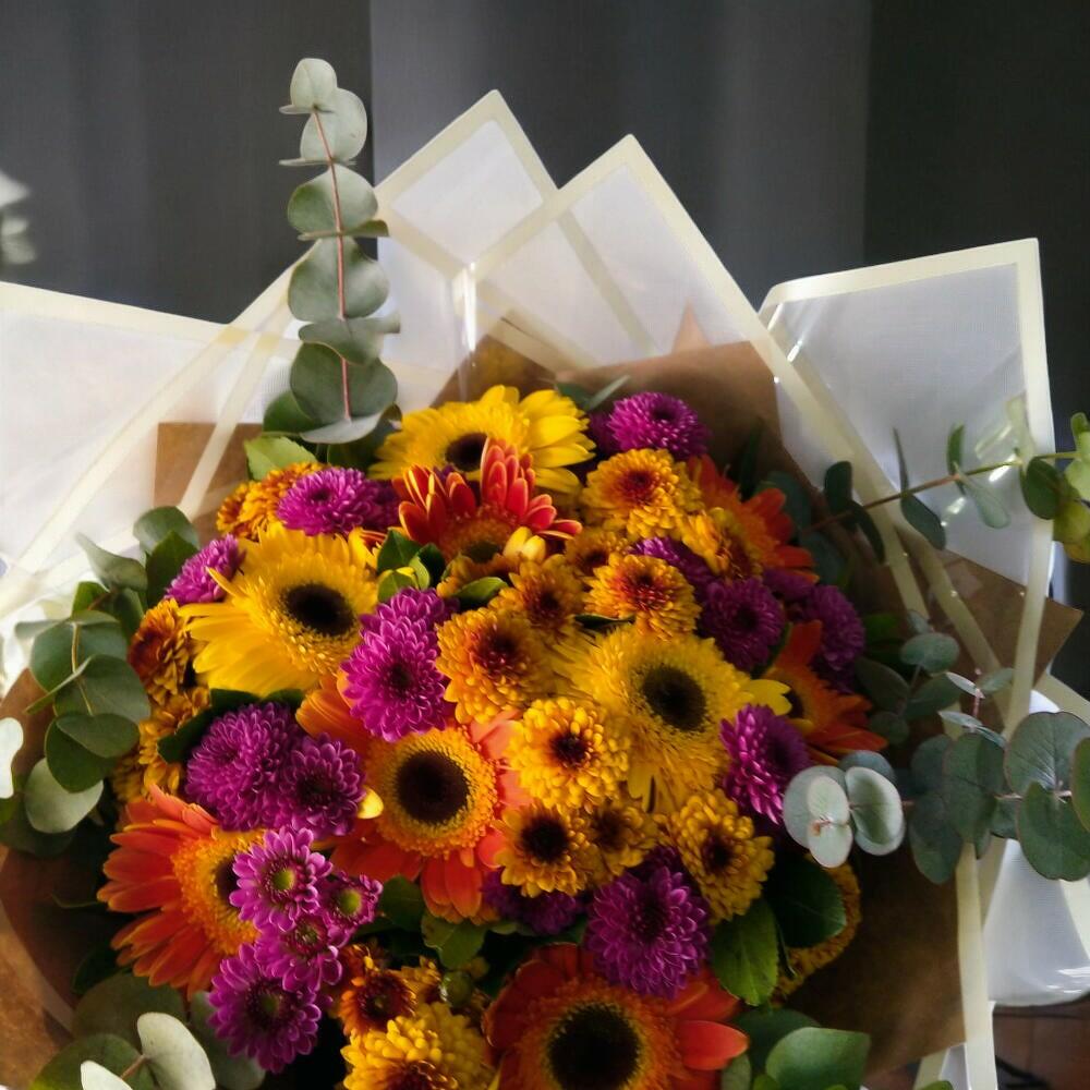 Gerbera - 10 adet okaliptüs - 6 adet krizantem - 15 adet