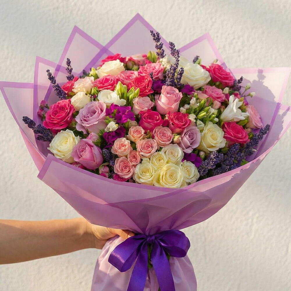 Renklerin uyumu ve çiçeklerin zarafetiyle hazırlanmış bu muhteşem Karışık Çardak Gül Buketi, sevdiklerinize duyduğunuz sevgiyi en estetik haliyle ifade etmenin yolu. Pembe güllerin romantizmi, beyaz güllerin saflığı ve lila güllerin zarafeti; hüsnüyusuf çiçeklerinin canlılığıyla tamamlanarak etkileyici bir bütün oluşturur. Mor kurdelesiyle tamamlanan bu buket, doğum günü, yıl dönümü, Sevgililer Günü veya sadece Seni seviyorum demek için kusursuz bir tercihtir. Bakım Önerisi: Buketi serin ve güneş ışığından uzak bir yerde muhafaza edin. Vazoya yerleştirirken saplarını çapraz şekilde kesip taze suya koyun. Suyunu her iki günde bir yenileyerek çiçeklerin daha uzun süre canlı kalmasını sağlayabilirsiniz.