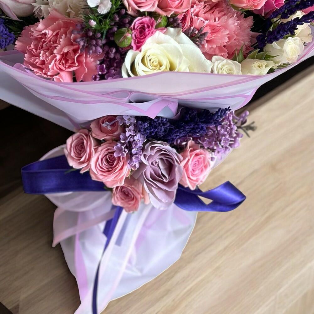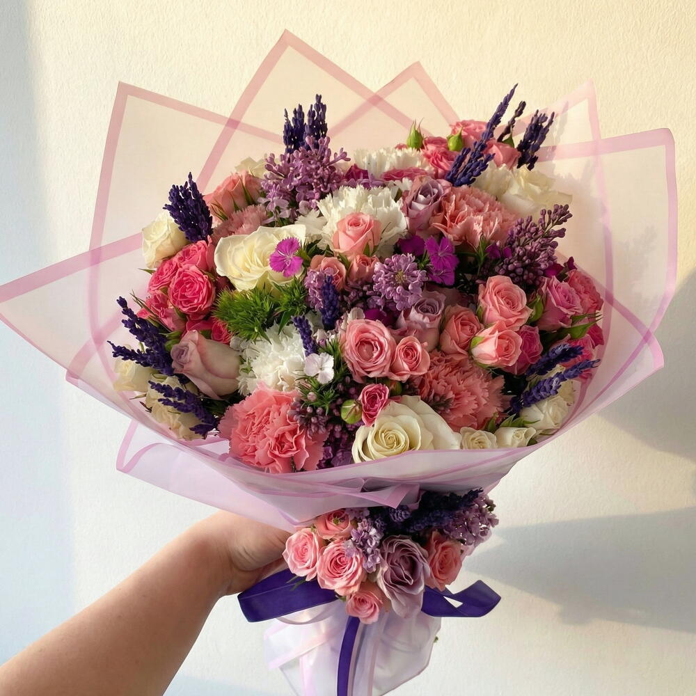 lavanta (kurutulmuş çiçekler) demet - 5 adet leylak - 5 adet lila gül - 5 adet hüsnüyusuf çiçeği - 5 adet pembe çardak gül - 5 adet fuşya çardak gül - 5 adet beyaz karanfil - 5 adet pembe karanfil - 5 adet mor iris - 3 adet