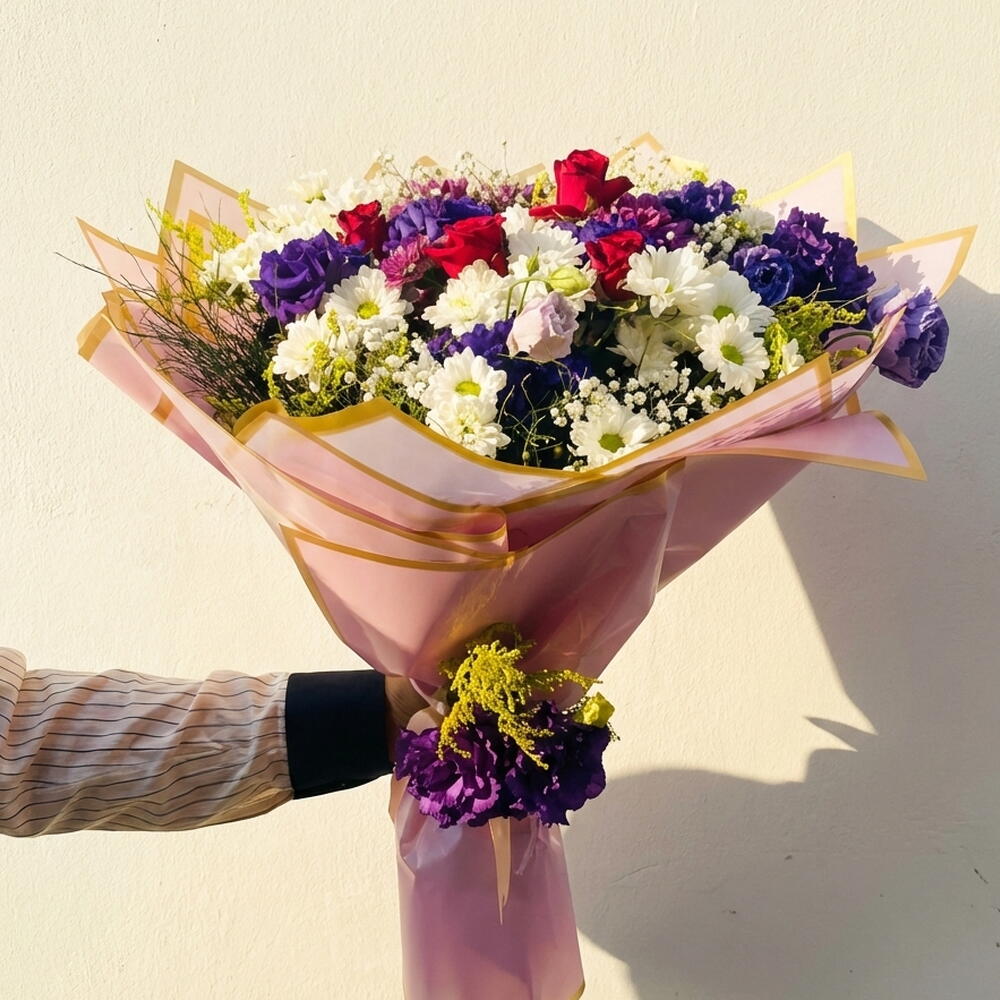 Romantik bir dokunuş ve renk cümbüşüyle tasarlanmış olan bu karışık çiçek buketi, kırmızı güllerin tutkusuyla başlar ve beyaz papatyalar, mor ve mavi lila çiçekleriyle huzur verir. Her çiçek, bir araya getirildiğinde zarif ve canlı bir atmosfer oluşturur. Beyaz gipso çiçekleri ve sarı virgatus, buketin güzelliğine taze ve doğal bir dokunuş eklerken, pembe buket kağıdı tüm tasarımı tamamlar. Bu buket, doğum günleri, özel kutlamalar veya sadece sevdiklerinize ne kadar değerli olduklarını göstermek için mükemmel bir seçimdir. Bakım Önerileri: Bu çiçek buketinin uzun süre taze kalması için, her çiçek türünün bakımına özen gösterilmelidir. Kırmızı güllerin ve beyaz papatyaların suya ihtiyacı olacaktır. Çiçeklerin saplarını her gün 2-3 cm kadar keserek suya yerleştirmeniz, ömürlerini uzatacaktır. Çiçeklerinizi doğrudan güneş ışığından uzak, serin ve nemli bir ortamda tutarak canlılıklarını koruyabilirsiniz.