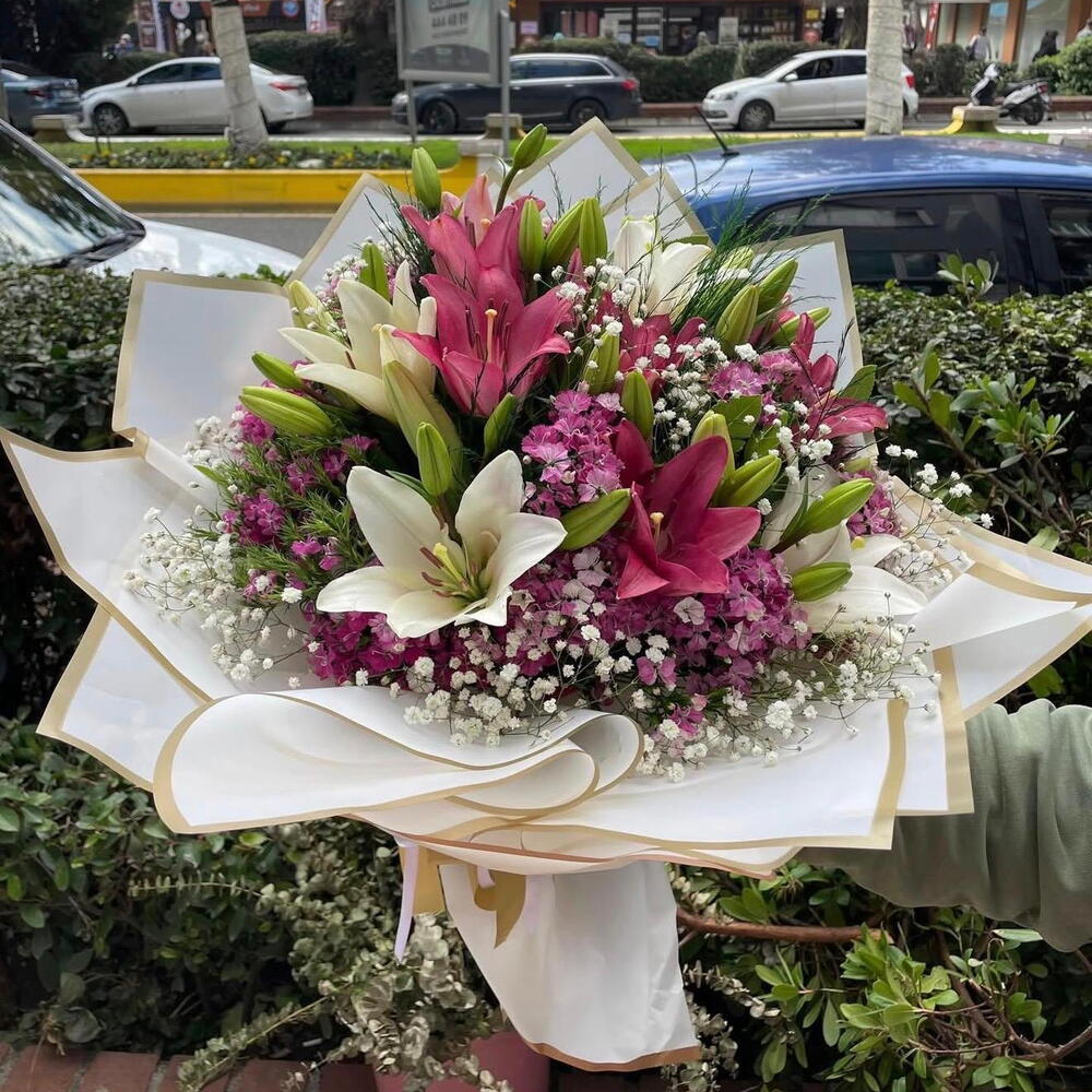Beyaz ve pembe lilyum ile aralarına renk katan Hüsnü Yusuf çiçekleri ile özel bir tasarım sevdiklerinize heyacan verlcl bir hediye olacaktır