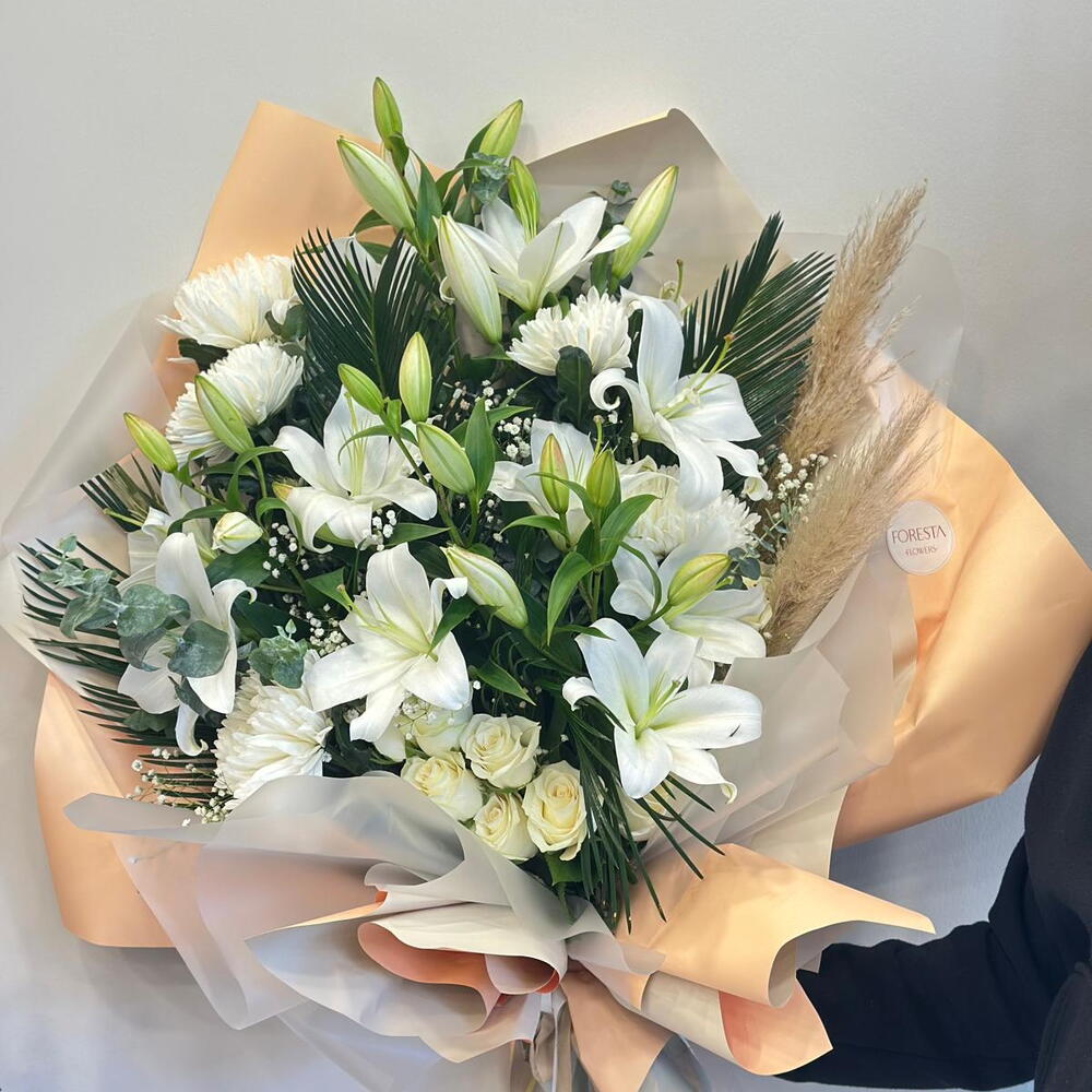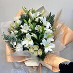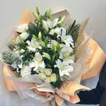 anastasia - 5 adet lilyum - 7 adet beyaz gul - 5 adet yesil yaprak dolgu - 2 adet