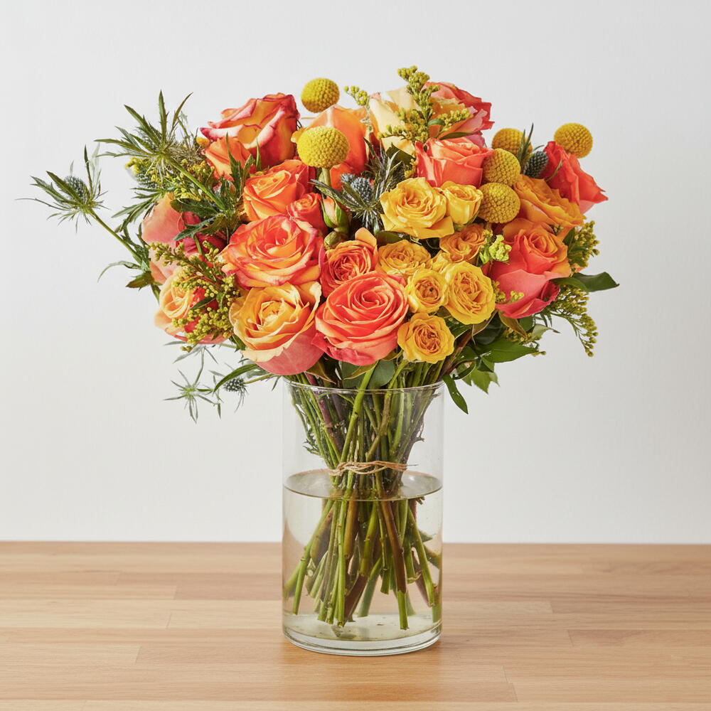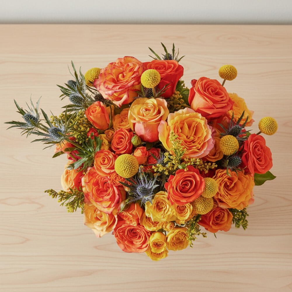 okaliptus - 5 adet turuncu gül - 13 adet çardak turuncu - 15 adet top aksesuar - 3 adet soli çiçeği - 4 adet diken tacı - 4 adet