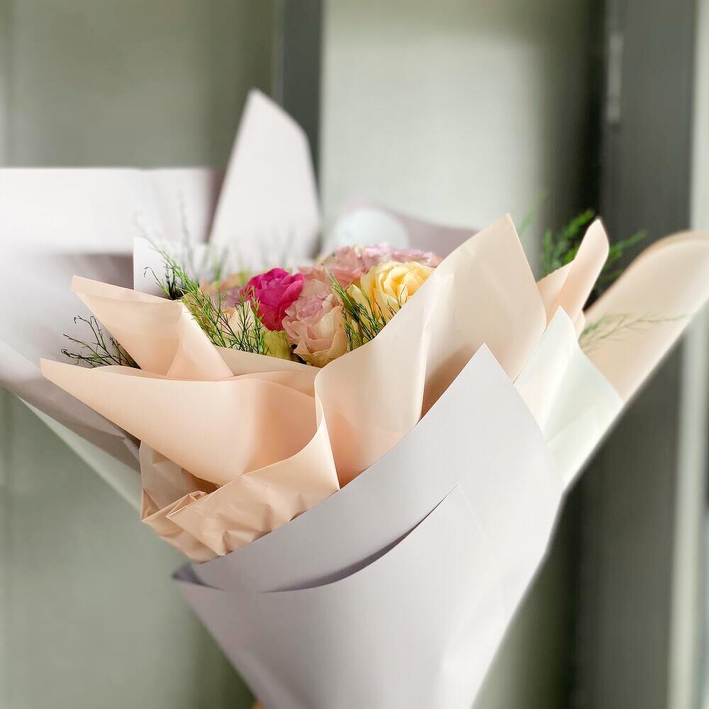Ribbon - 2 adet Pink rose - 10 adet cream rose - 10 adet green leaf - 5 adet bouquet paper - 5 adet lilla rose - 10 adet