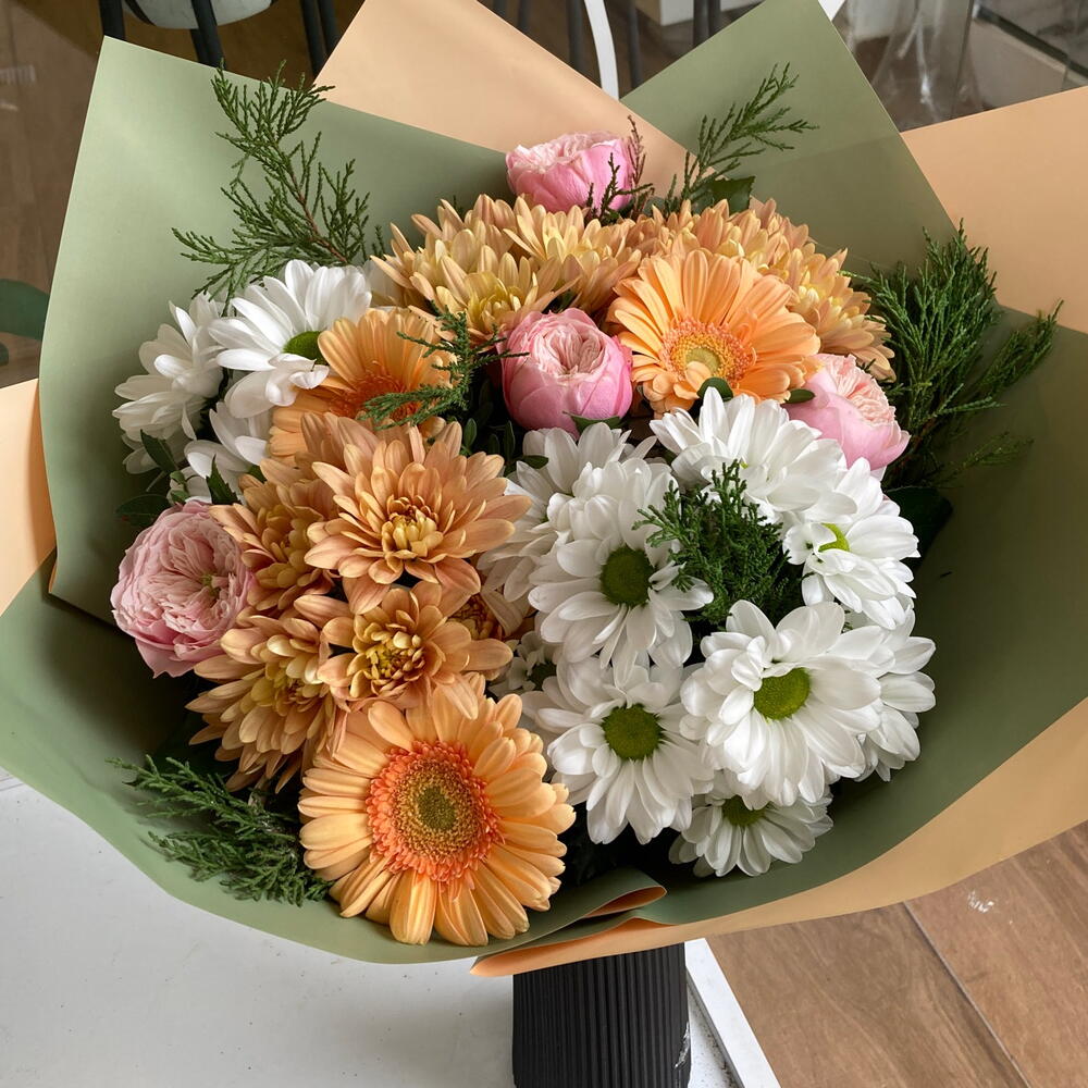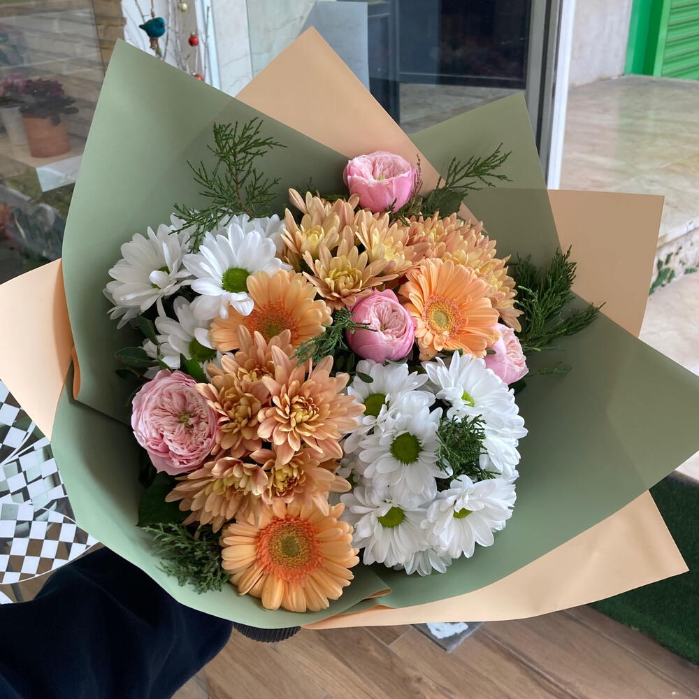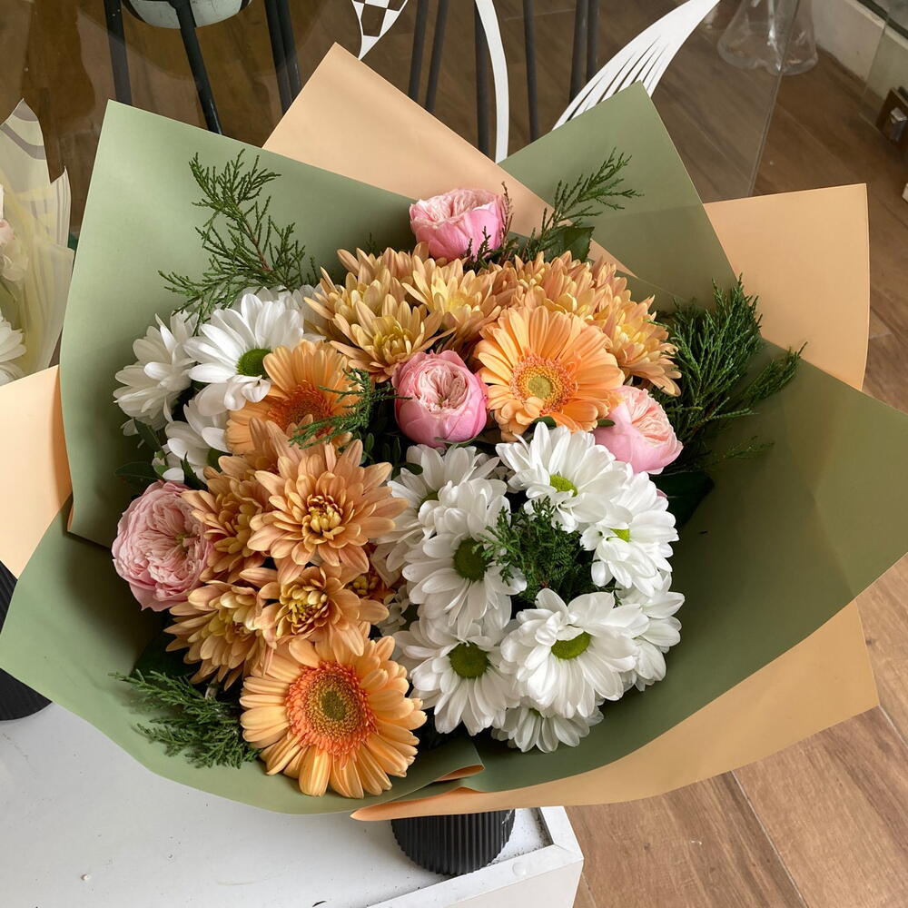 Bu özel çiçek buketi, 18 adet turuncu kasımpatı, 4 adet pembe şakayık gülü, 13 adet beyaz papatya ve 3 adet turuncu gerbera ile bezenmiştir. Aralarına serpiştirilmiş 6 adet çam dalı ise buketin doğal ve taze görünümünü tamamlamaktadır. Tüm bu renkler ve çiçekler, her biri ayrı güzellikte olan bu çiçekleri bir araya getirerek muhteşem bir uyum sağlamaktadır. Bu çiçek buketi, sevdiklerinize özel hissettirecek mükemmel bir hediye olacaktır.