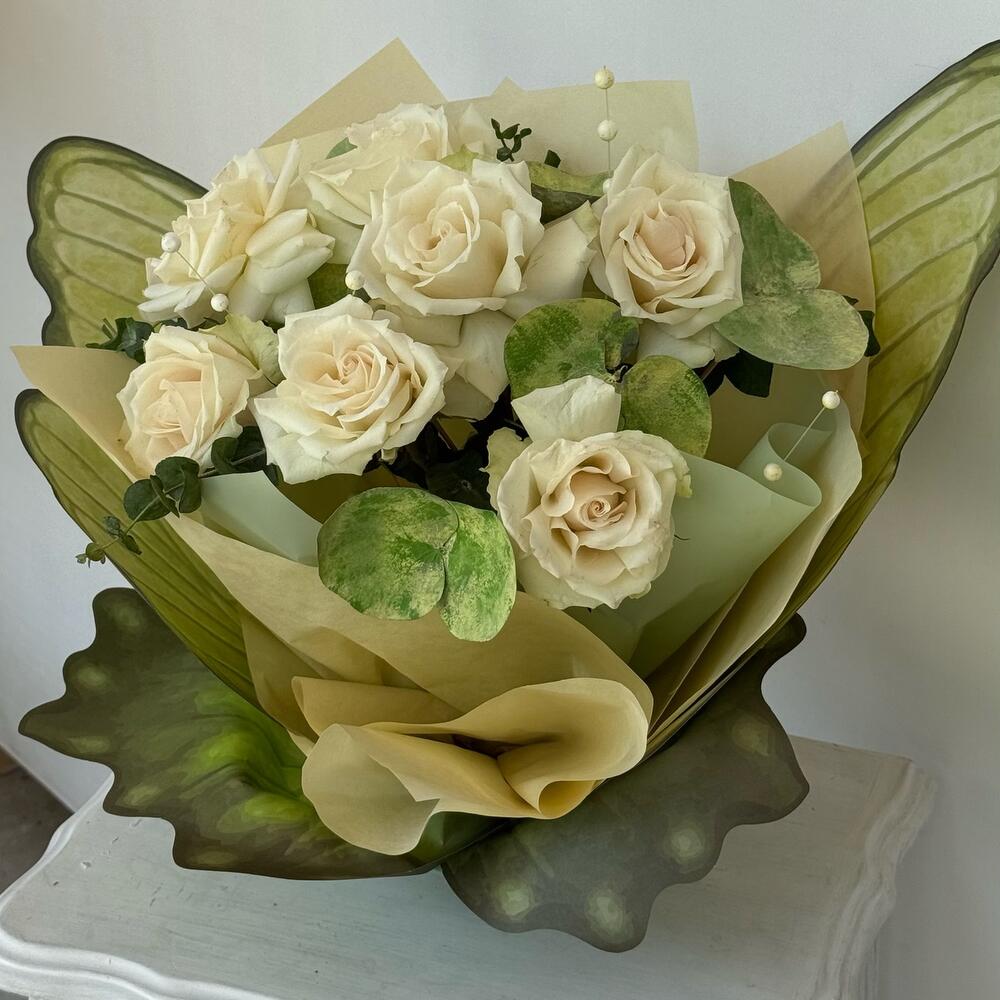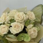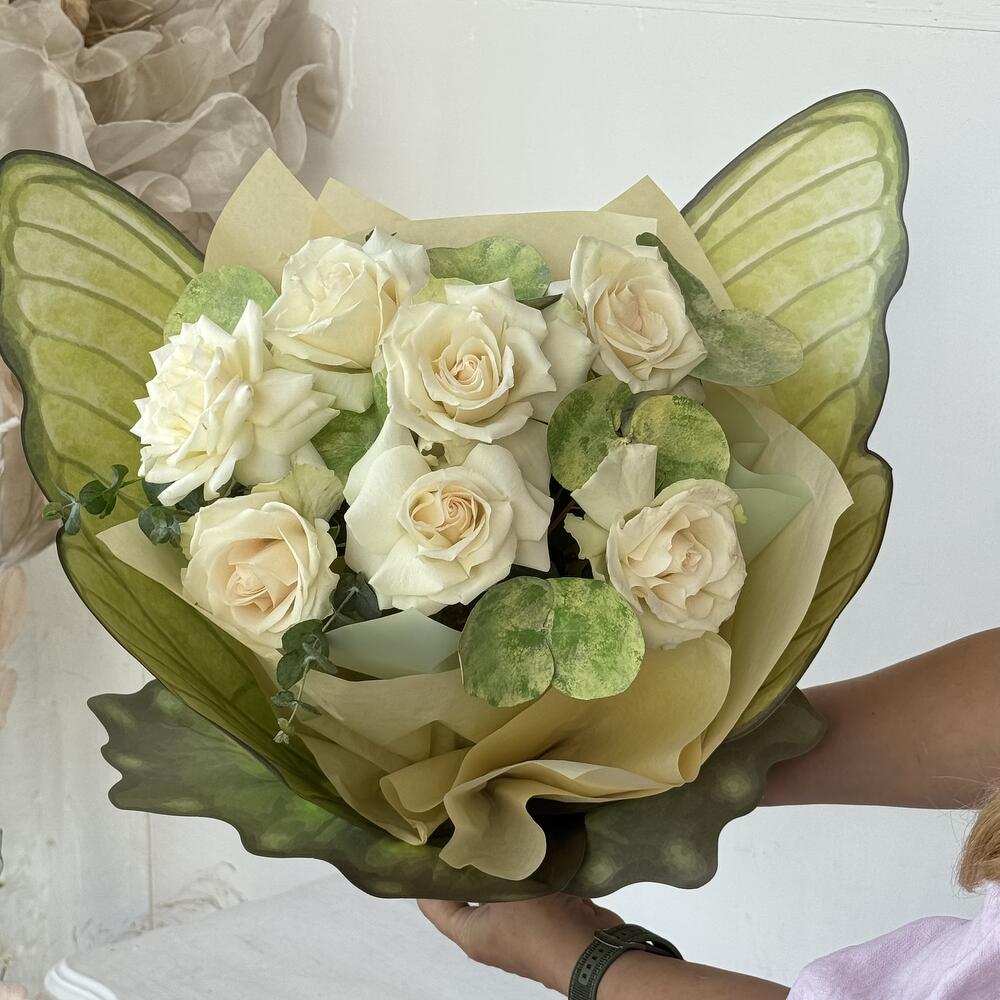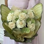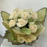 Хороший букетик, необычный, самый недорогой с розами. Внизу, вроде как, флористическая губка. Доставка отлично в срок.