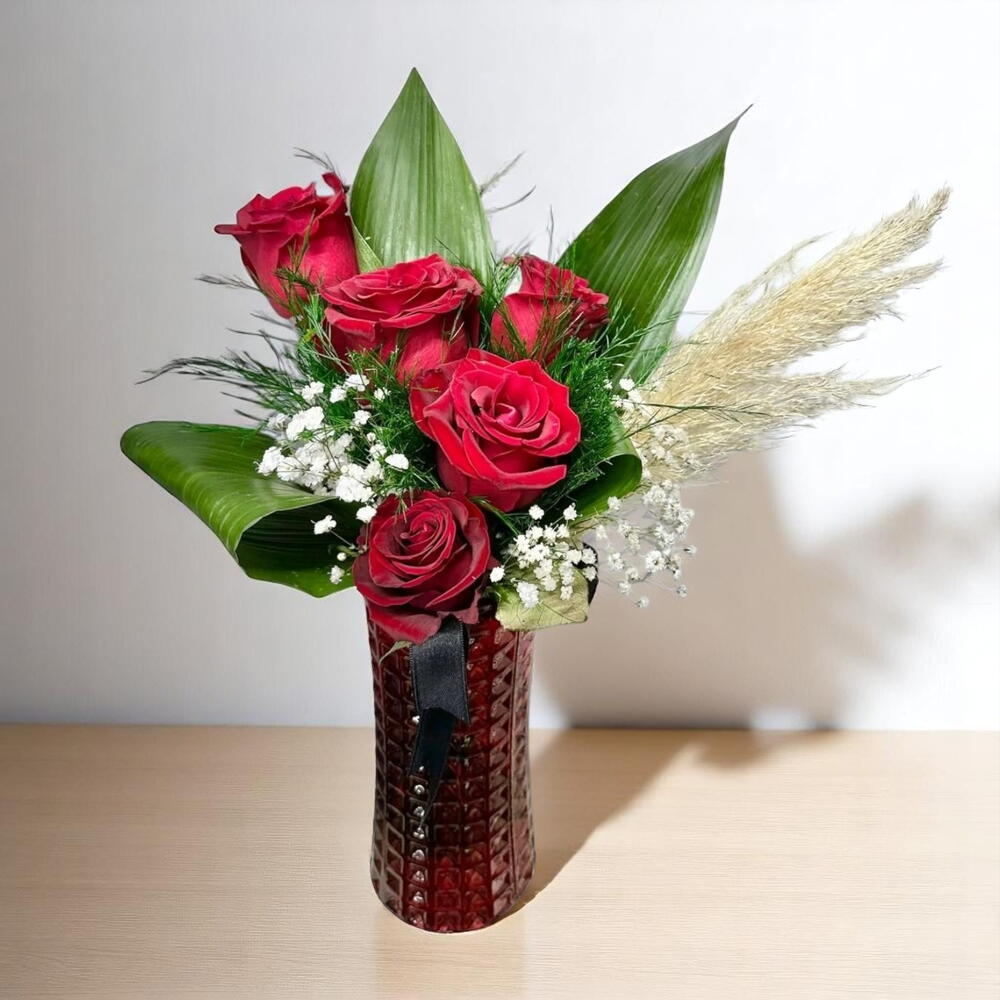 Kırmızı güllerin zarifliği, bu özel arajman kusursuz bir şekilde bir araya geliyor. Aşkın sembolü kırmızı güller, yeşil yapraklar ve zarif bebek nefesi çiçekleriyle tamamlanarak şıklığı ve doğallığı yansıtıyor. Buket, modern bir dokunuşla şık bir şişe vazo içinde sunulmuş, estetik bir görünüm elde edilmiştir. İhtişamlı ama sade, zarif ama etkileyici bir tasarıma sahip bu buket, sevdiklerinize olan duygularınızı en güzel şekilde ifade etmenin yolu olacak. Özellikle romantik anlar ve özel kutlamalar için harika bir tercih.