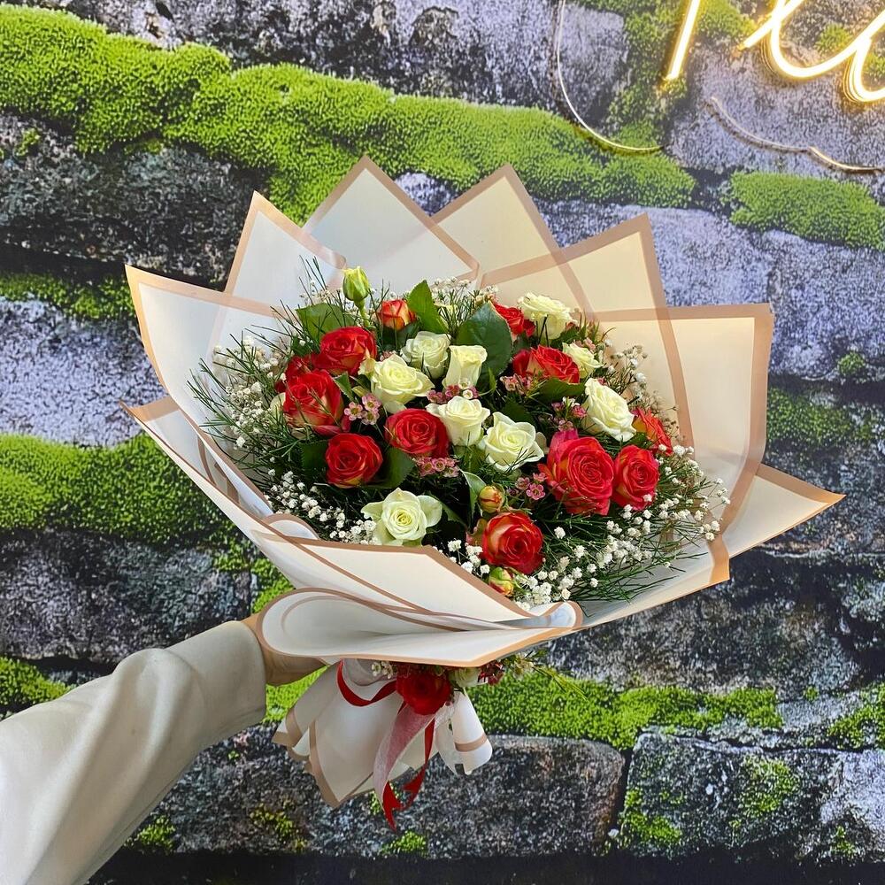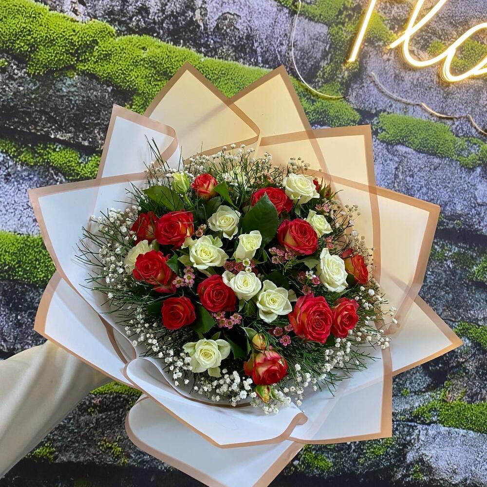 Bu çarpıcı çiçek buketi, deneyimli floristlerimiz tarafından özenle hazırlanmıştır. İçerisinde romantik ve tutkulu kırmızı çardak gülü 13 adet ve masumiyetin ve saflığın simgesi beyaz çardak gülü 12 adet mevcuttur. Bu iki güzel gül türü, şık ve minimalist cipso ile tamamlanır. Bu çiçeklerin güzel kombinasyonu, sevdiklerinize olan sevginizi ve değerinizi mükemmel şekilde iletecektir.