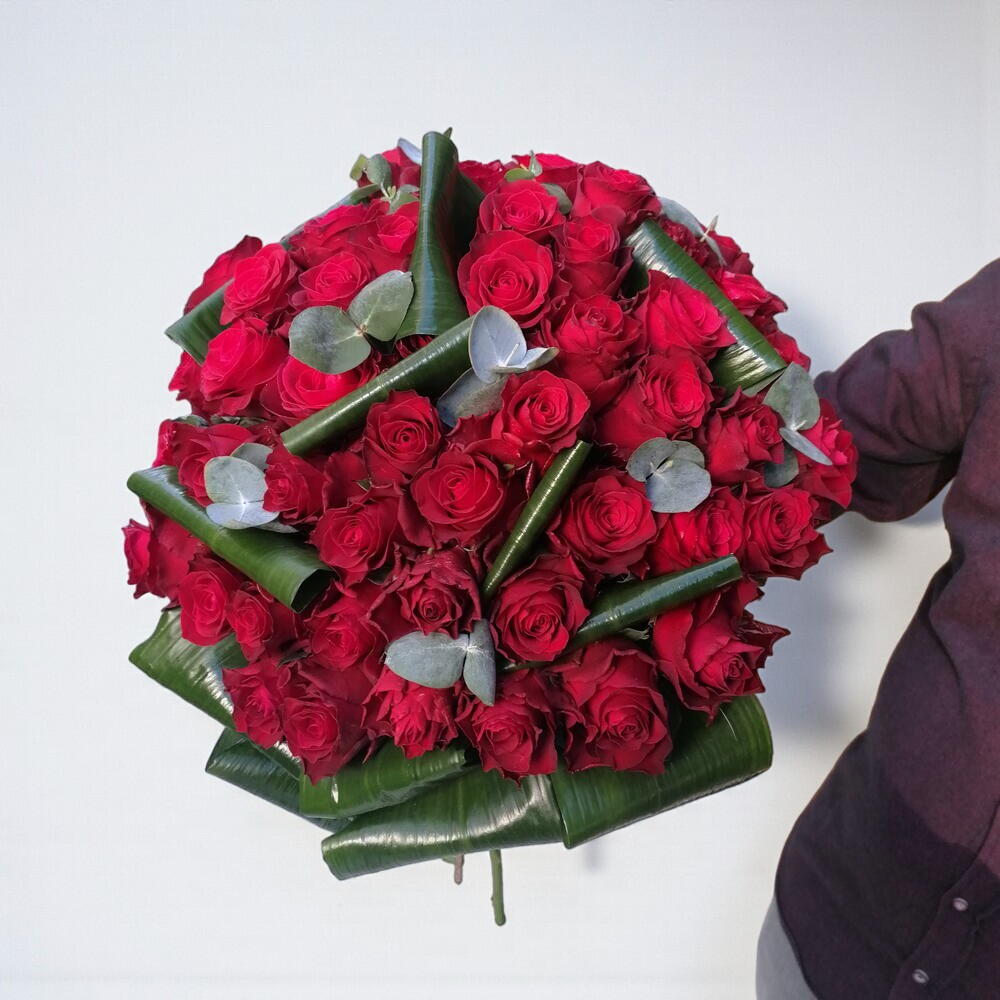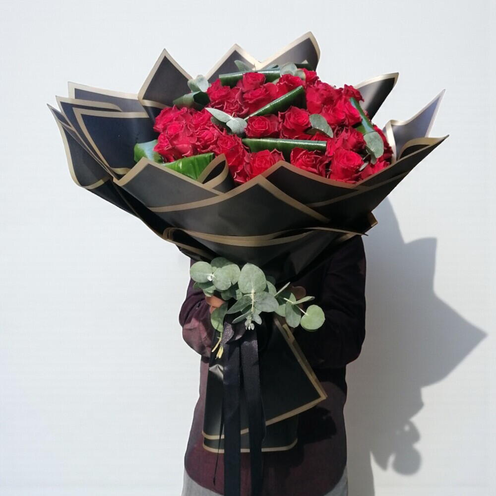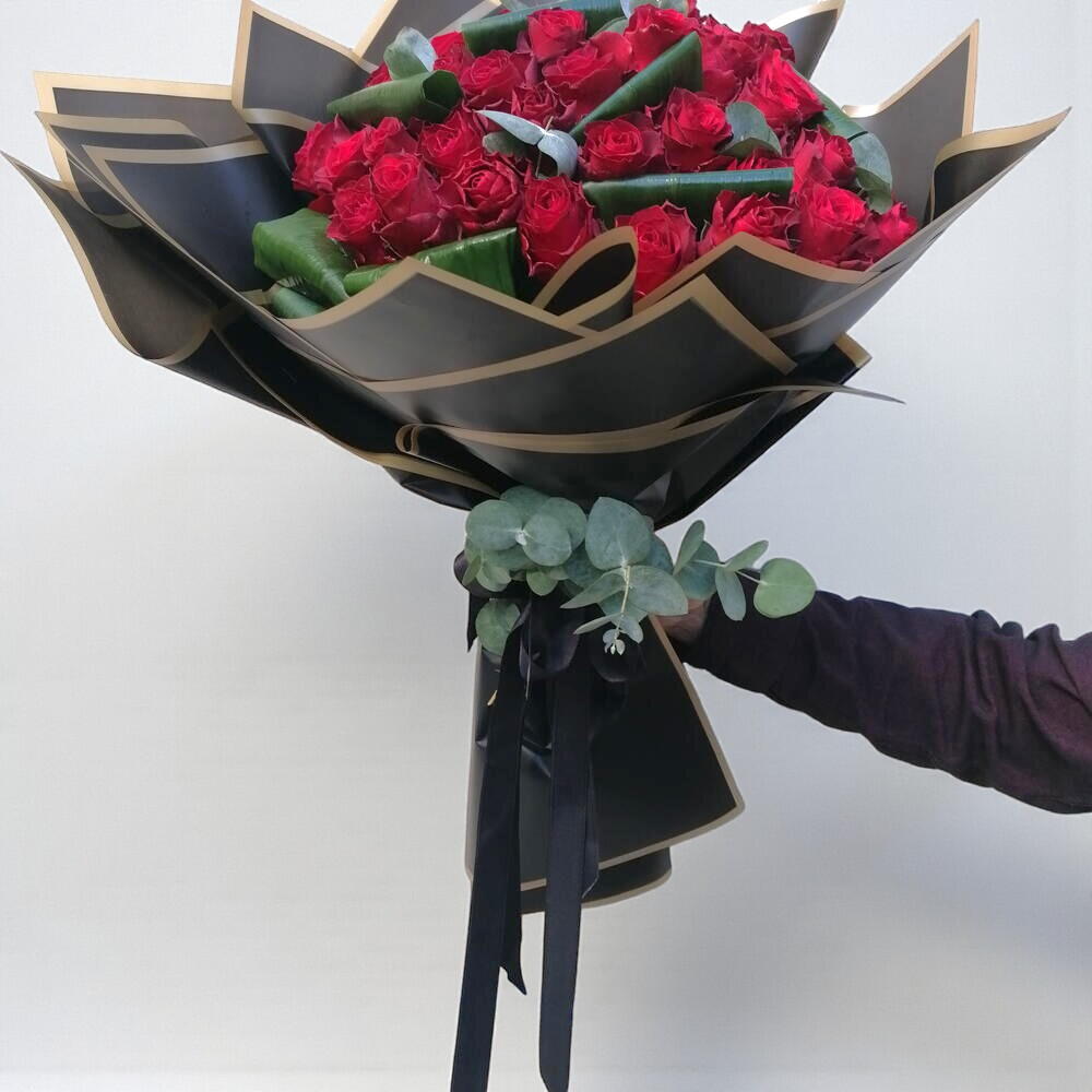 Güçlü bir zarafet ve tutkunun ifadesi olan bu kırmızı gül buketi ❤️, etkileyici tasarımıyla göz kamaştırıyor. Katmanlı şekilde yerleştirilmiş gül demetleri, derin yeşil yapraklarla çevrelenerek dikkat çekici bir hacim oluşturuyor. Siyah ve altın detaylı ambalajı ise bukete modern ve lüks bir görünüm kazandırıyor. Romantik anlar, yıldönümleri veya özel sürprizler için mükemmel bir seçimdir. Buketinizin uzun ömürlü olması için her iki günde bir sap uçlarını kısaltın, taze suyla dolu bir vazo içinde muhafaza edin. Direkt güneş ışığından uzak, serin bir ortamda saklayarak güllerinizin canlılığını koruyabilirsiniz.
