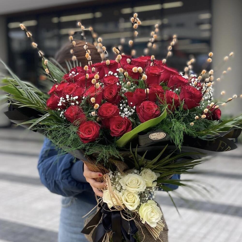kırmızı gül - 71 adet beyaz gül - 5 adet kuru çiçekler - 5 adet yesillik - 5 adet