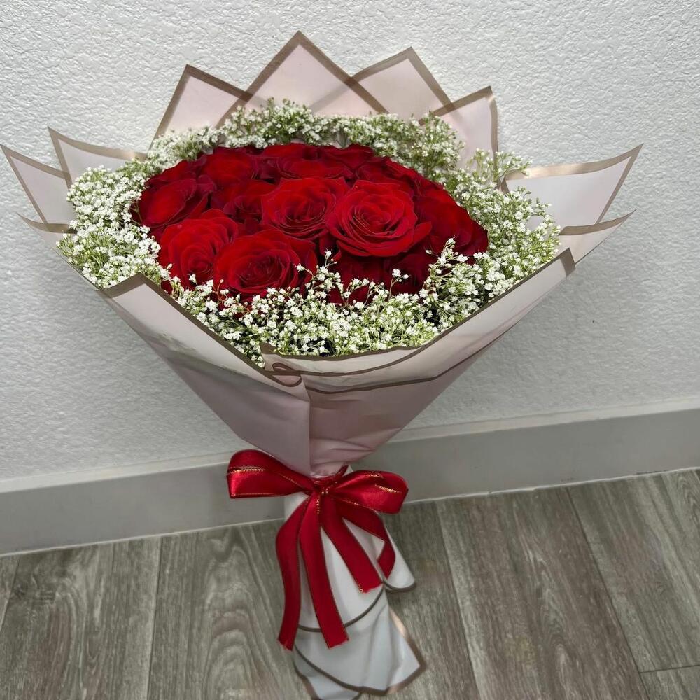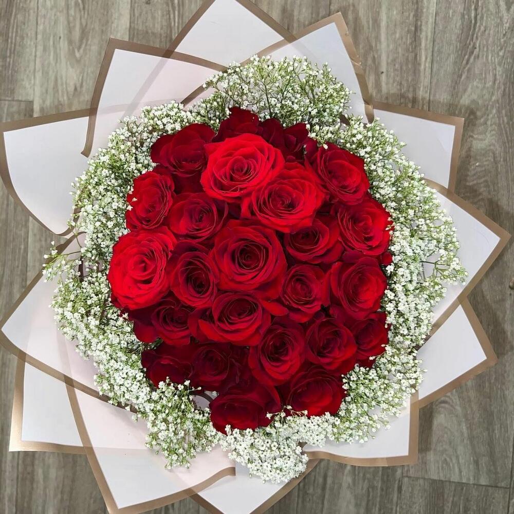 Bu büyüleyici çiçek buketi, 27 adet canlı kırmızı gülle süslenmiştir. Her bir gül, aşk ve tutkunun sembolü olup, size ve sevdiklerinize özel anlar yaratmak için özenle seçilmiştir. Bu zarif çiçek buketi, tüm özel günlerinizde ve etkinliklerinizde mükemmel bir seçim olacaktır. Bu gül buketi kalite, estetik ve zarafeti bir arada barındırır.