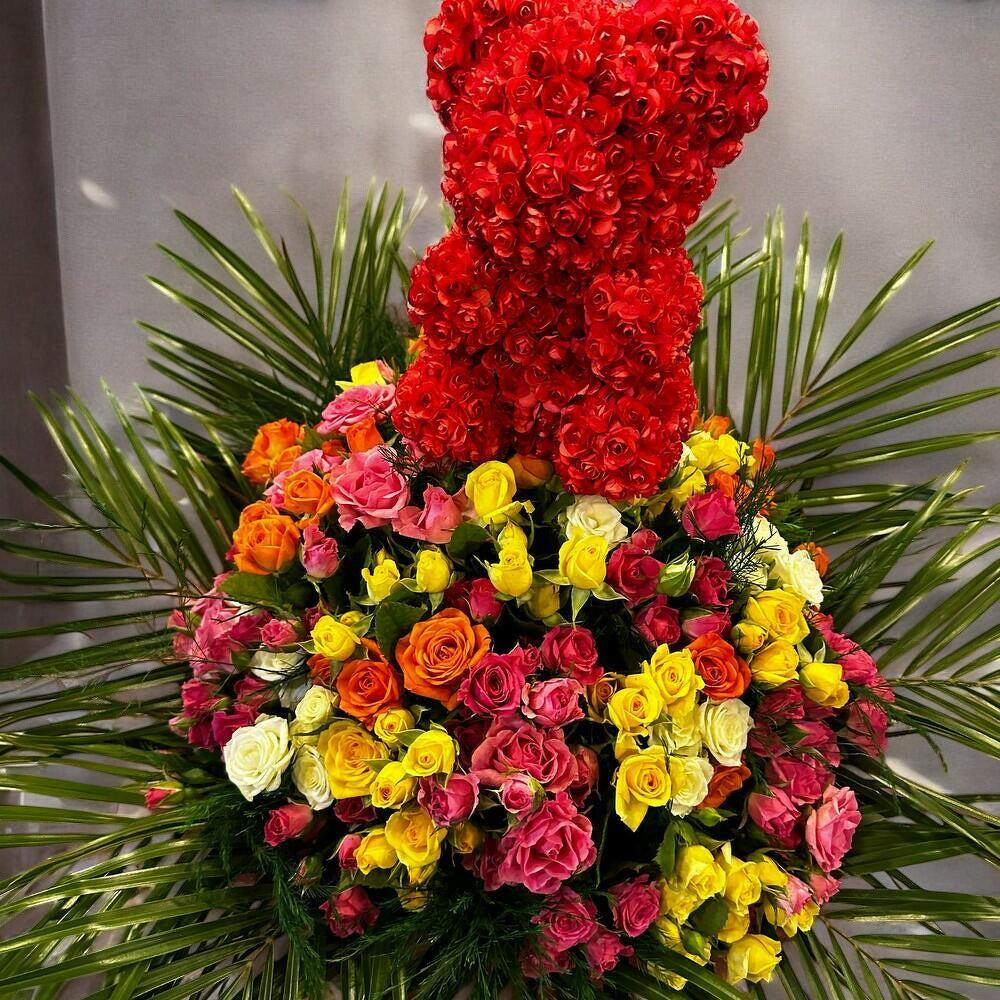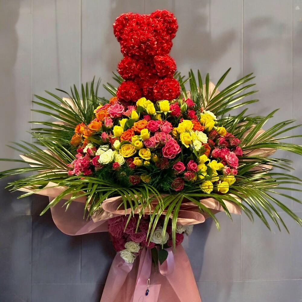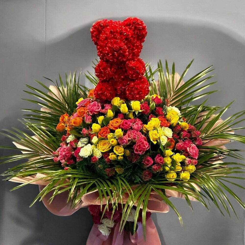 Sevgi dolu bir jest arıyorsanız bu eşsiz tasarım tam size göre! Renkli sprey güllerin canlılığı ile hazırlanmış, kırmızı güllerden oluşan ayıcık figürü bu buketi unutulmaz bir hediyeye dönüştürüyor. Göz alıcı renk paletiyle romantik bir atmosfer yaratırken, özel günlerde sevdiklerinizi şaşırtmanın en tatlı yolu olacak. Bakım Bilgisi: Buketin uzun ömürlü olması için su seviyesi günlük olarak kontrol edilmelidir. Çiçekler doğrudan güneş ışığına maruz kalmamalı, serin ve aydınlık bir ortamda muhafaza edilmelidir. Vazonun suyu 2 günde bir tazelenmeli, yapraklara su sıçratmadan sadece gövde kısmı suya temas etmelidir.
