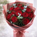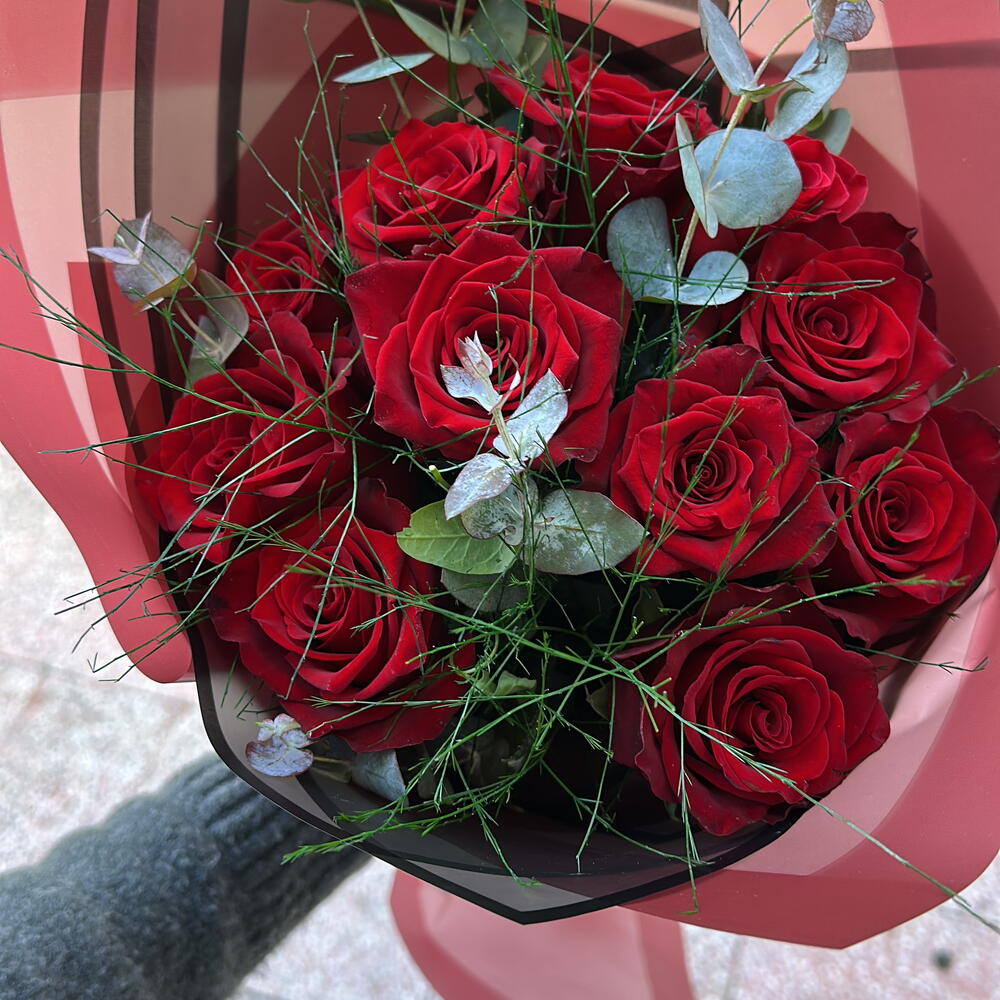 Bu sofistike çiçek buketi, 2 adet zarif okaliptus ve 11 adet büyüleyici gül buketi ile süslenmiştir. Bu birleşim, zarif bir görüntü ve taze bir koku oluşturur. Gösterişli bu çiçek aranjmanı, özel birine olan sevginizi veya takdirinizi ifade etmek için mükemmel bir seçenektir. Her bir çiçek dikkatlice seçilmiştir ve buketin genel düzeni, ona çarpıcı ve unutulmaz bir görünüm kazandırır.