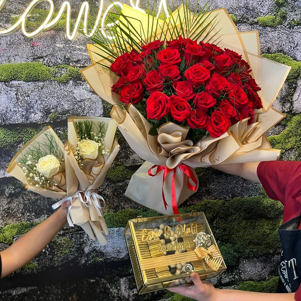 kırmızı gül - 41 adet çikolata - 150 adet çikolata kutusu - 1 adet tek gül - 2 adet