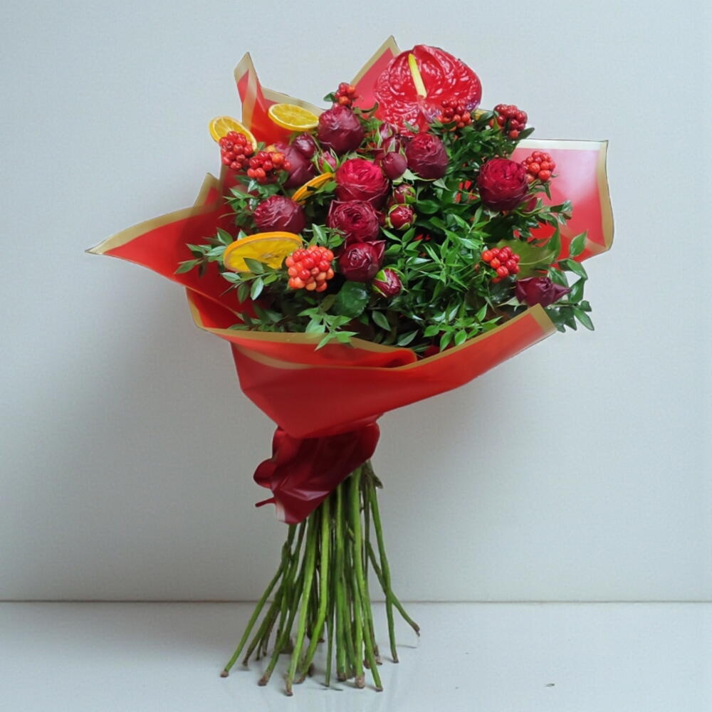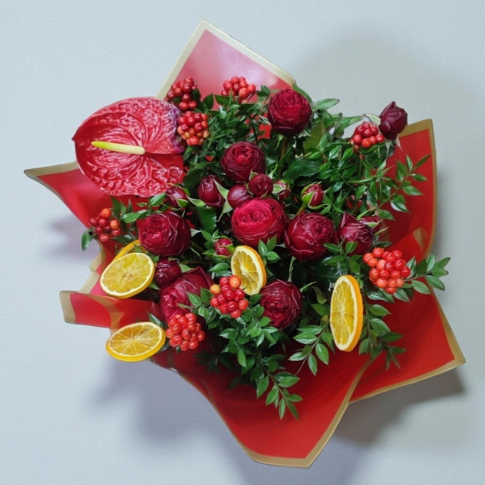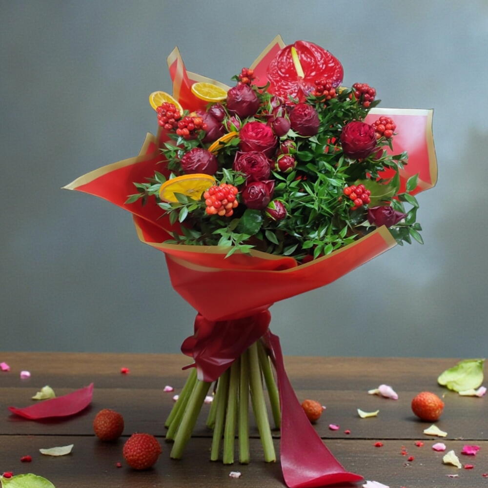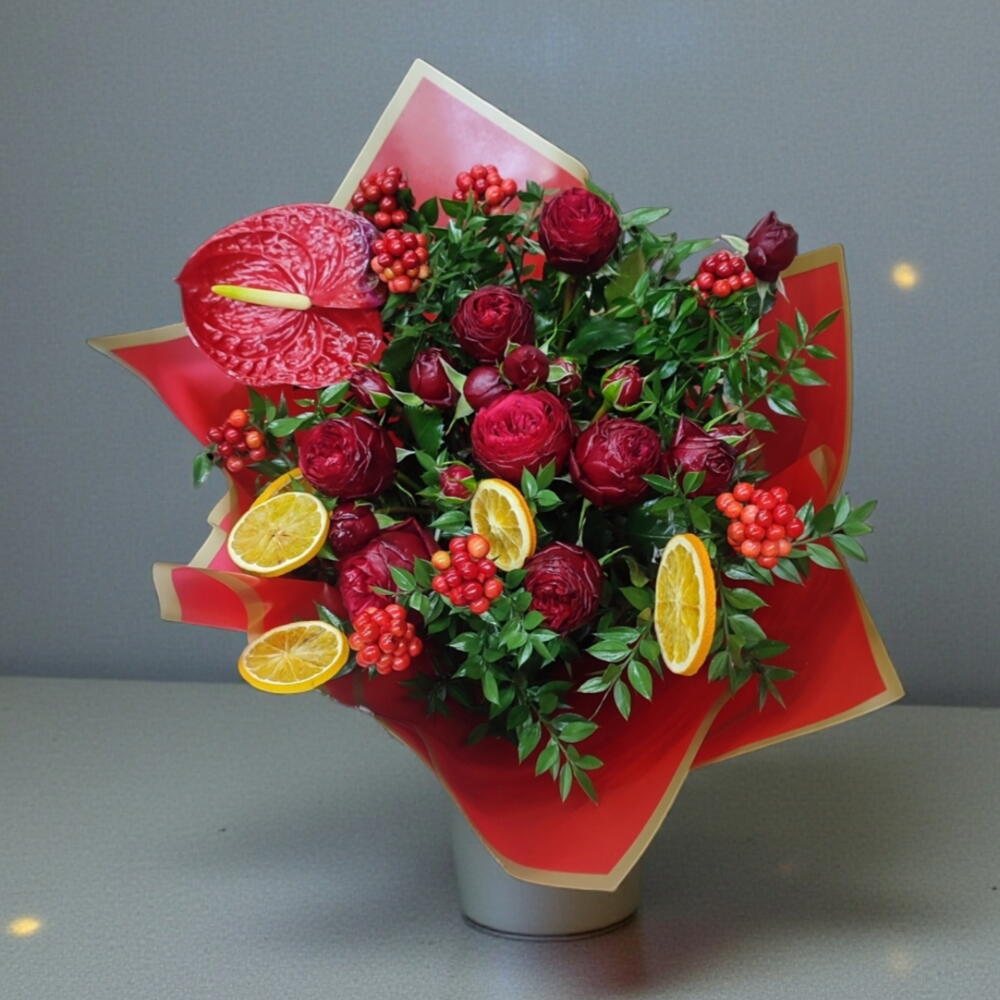 portakal dilimi - 3 adet kokina şans çiçeği - 7 adet antoryum yaprağı - 1 adet tomurcuk gül - 7 adet