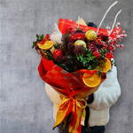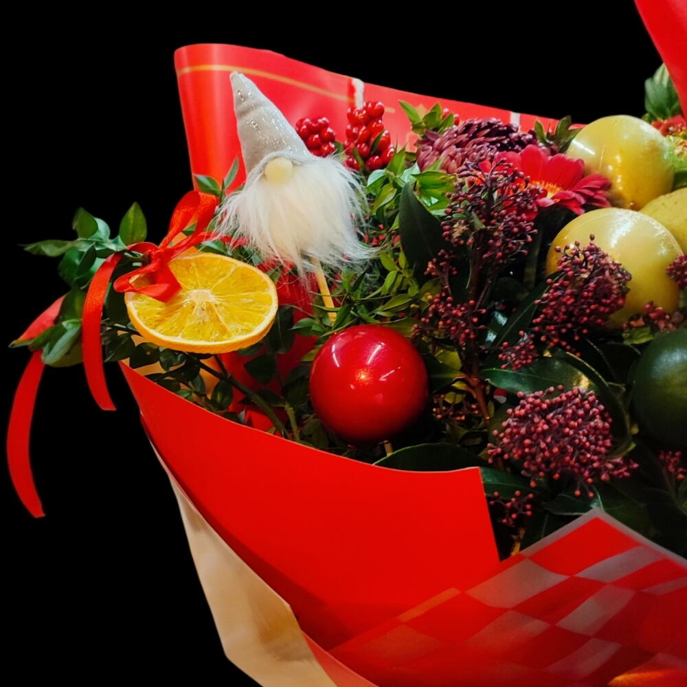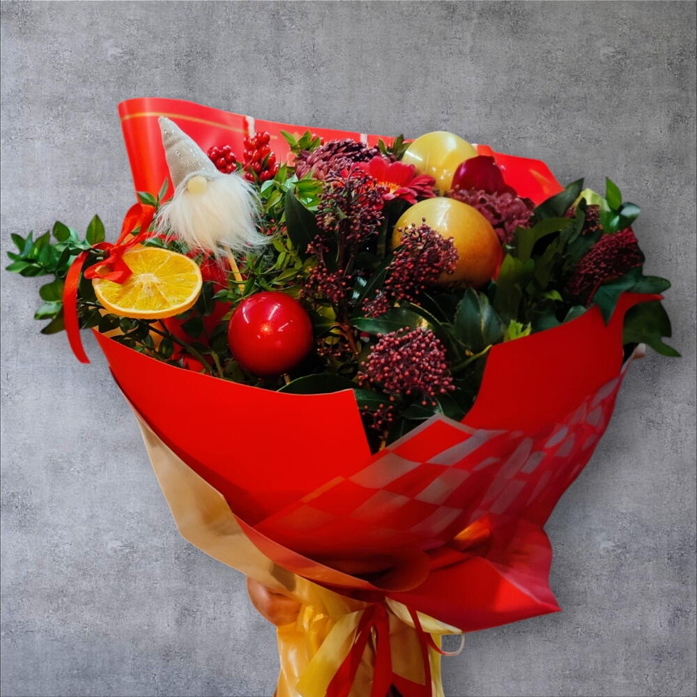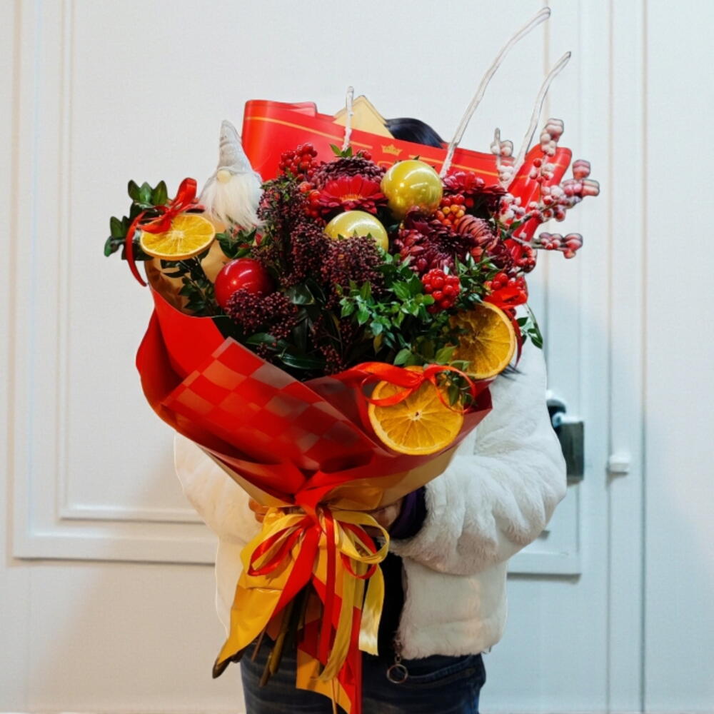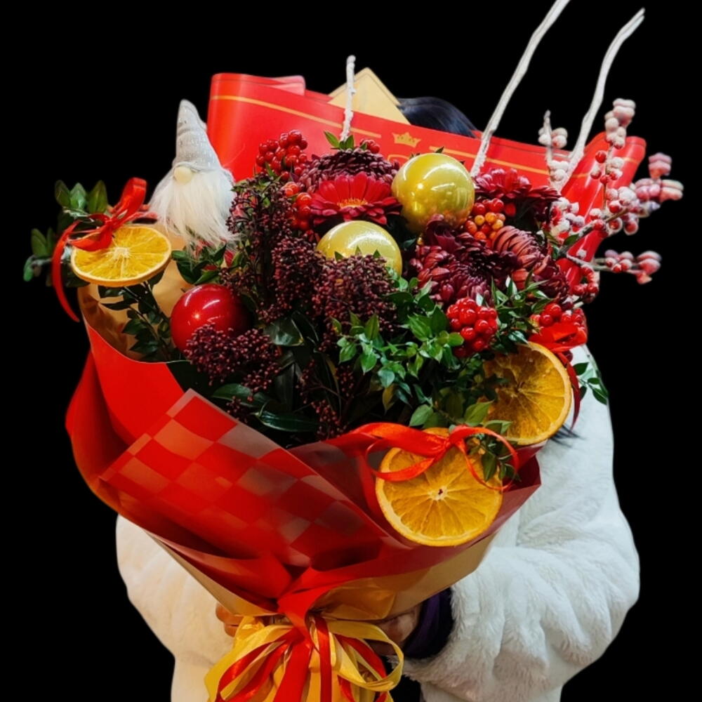 gerbera mini - 3 adet anastasia - 3 adet kokina - 6 adet portakal dilimi - 3 adet kokina dal - 1 adet top dekor - 3 adet japonica- skimmia - 3 adet elf cüce dekor - 1 adet