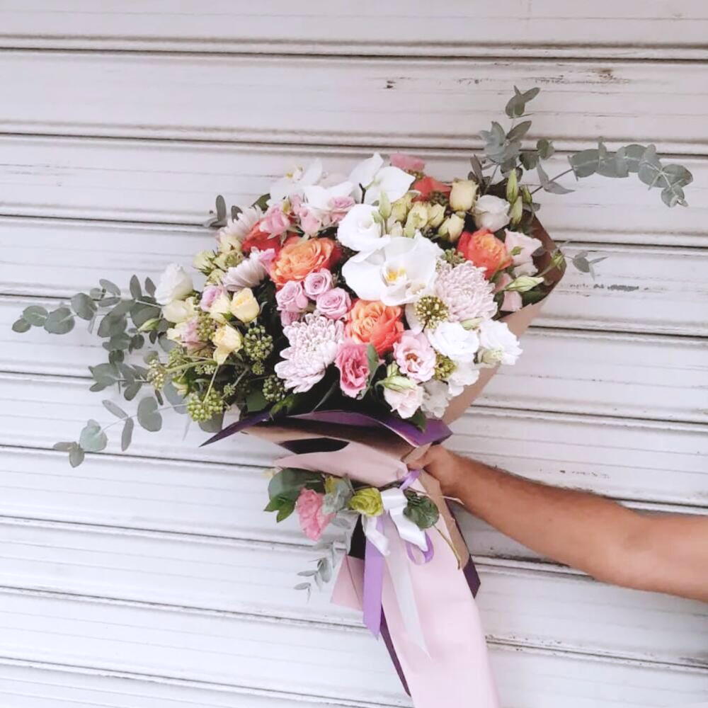 Bu zarif buket, pastel tonlarının muhteşem uyumuyla görsel bir şölen sunuyor. Buket, gül ve orkide gibi zarif çiçeklerin yanı sıra, rengarenk krizantemler ve yeşil dokunuşlarla zenginleştirilmiş. Buket, duygusal anları daha özel kılmak, sevdiklerinize sevgi ve şefkat göstermek için mükemmel bir seçimdir. Güllerin ve orkide çiçeklerinin zarif görüntüsüyle şıklığı simgeliyor. Çiçeklerinizi taze tutabilmek için suyu her 2 günde bir değiştirin. Sapları her 2-3 günde bir taze kesmek, çiçeklerin ömrünü uzatır. Buketi doğrudan güneş ışığından koruyarak, daha uzun süre güzel kalmasını sağlayabilirsiniz.