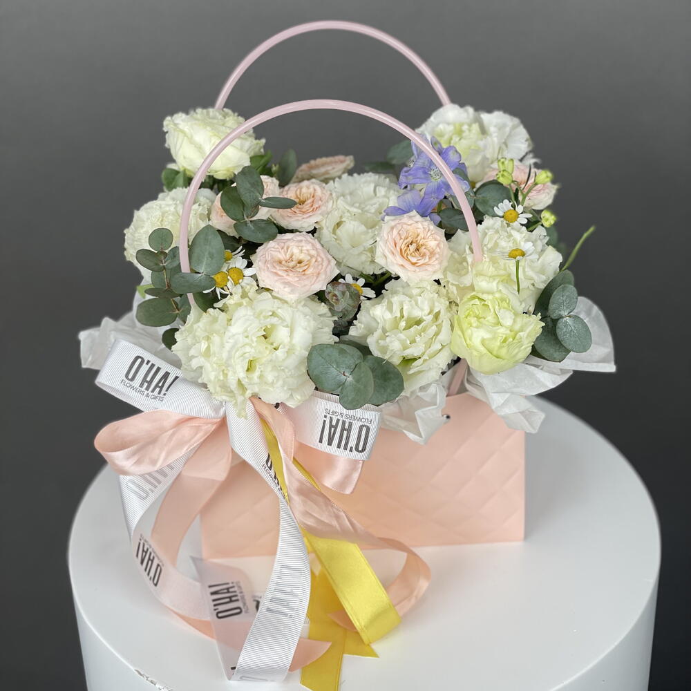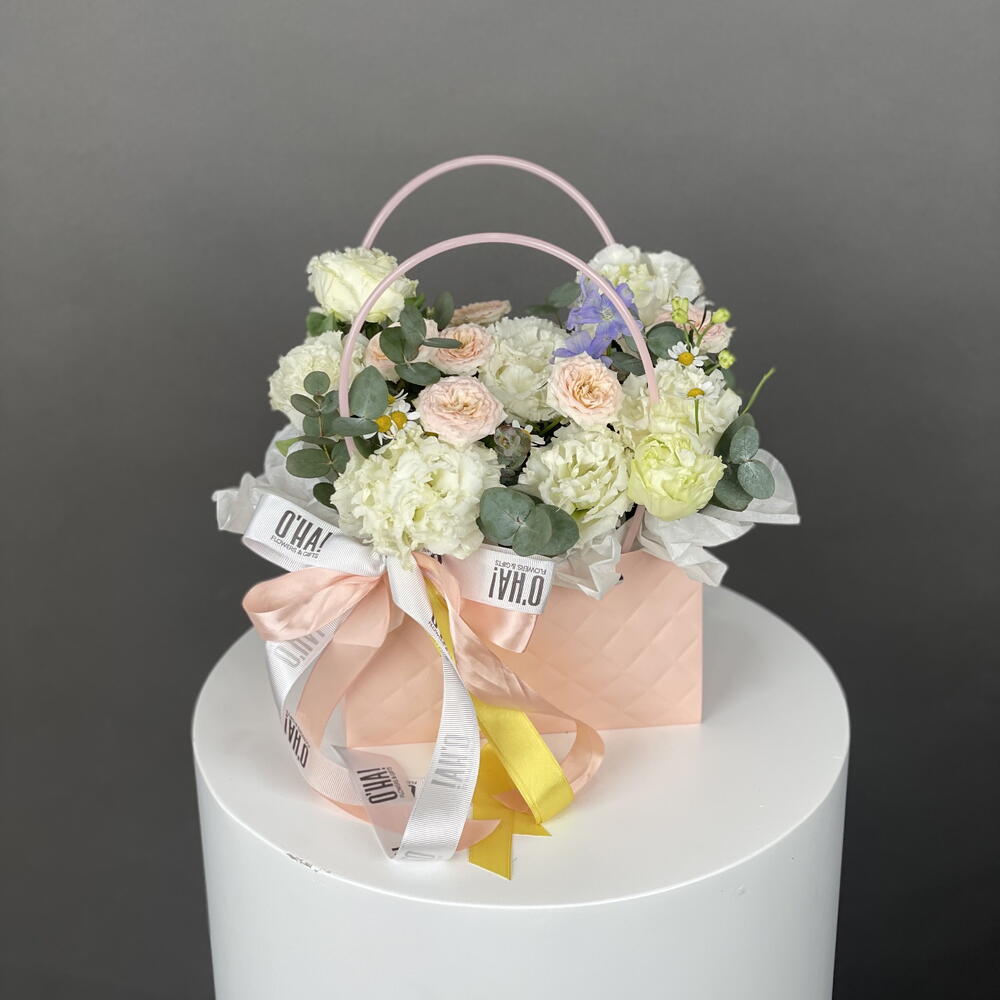 Bu çarpıcı Kutuda Çiçekler, 5 adet beyaz Eustoma, 1 adet Delphinium, 1 adet sprey gül ve şık bir çanta içerir. Bu muhteşem çiçek aranjmanı, evinize veya ofisinize zarafet ve sofistike bir dokunuş katacaktır. Ayrıca, bu kutuda çiçekler mükemmel bir hediye seçeneği olabilir. Bu güzel çiçeklerin her birini özenle seçtik ve en taze ve en kaliteli çiçekleri sunmak için özel bir çanta ile birlikte paketledik.
