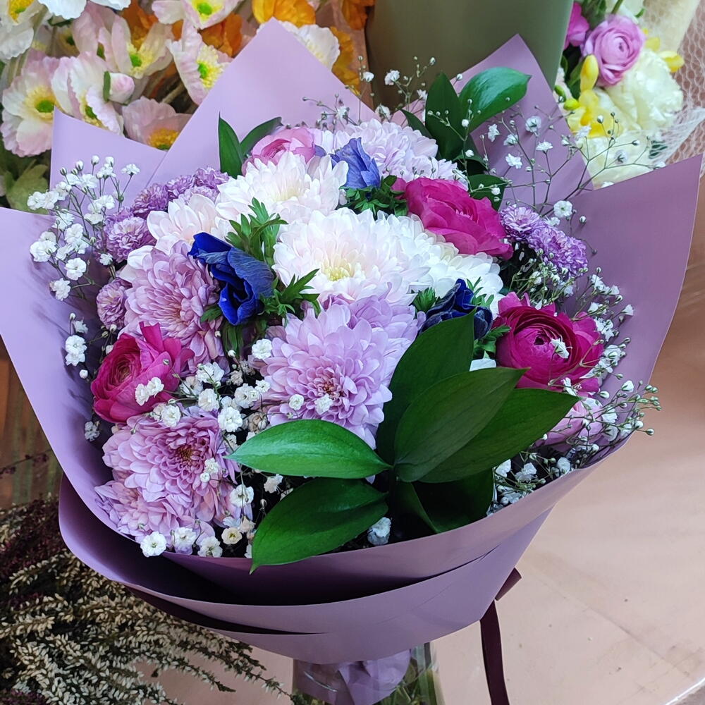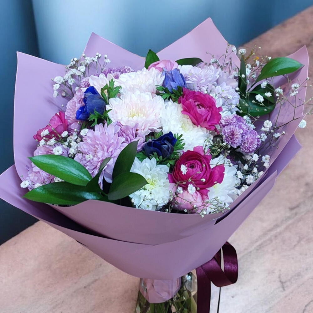 ranunculus pink - 3 adet cipso - 5 adet anemones mix - 3 adet krizantem ithal - 3 adet krizantem lila ithal - 5 adet pon pon krizantem lila - 3 adet